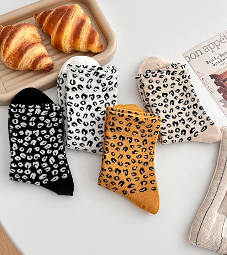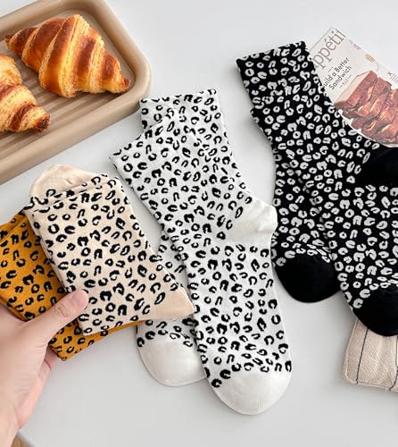• Trendy Leopard Print Design : These trendy socks feature a fashionable leopard pattern, perfect for adding a fun accent to any look. Available in vintage white, black, yellow, and versatile beige