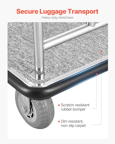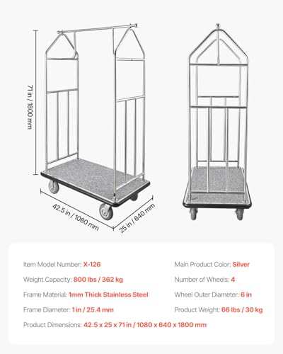 Brand: VEVORMaterial: Stainless SteelColor: SilverItem Weight: 66.14 PoundsStyle: Flat top type-6-SilverHeavy-Duty Capacity: This luggage cart is built for efficiency with a solid 800lbs capacity! Measuring 42.5 x 25 x 71 inches, it's ideal for hotels and resorts to quickly transport luggage. With a spacious base and stainless steel hanging rods, handling multiple pieces of luggage is a breeze.Durable & trendy Design: Made with 1mm thick stainless steel, this bellman cart is not just durable but stylish too! It’s resistant to rust and won’t bend or warp. It keeps its polished look even after years of service, making it the ideal functional and attractive addition to any hotel lobby.Smooth & Silent Wheels: Move luggage with ease! This hotel luggage cart has 4 heavy-duty rubber wheels—2 directional and 2 swivel—making it easy to glide across various surfaces like tile, wood, or carpet. It operates quietly and the rubber wheels keep floors scratch-free.Four Protective Features: The hotel bellman cart has a grey non-slip carpet base to secure luggage, plus side rails to keep items from falling off. Rubber bumpers absorb impact, avoiding damage to walls or elevators. A strong steel base adds extra stability during use.Easy Assembly: With the easy-to-follow instructions included, you can assemble this valet cart in just five simple steps and start using it right away! Perfect for everyday use. first-class materials and excellent craftsmanship ensure long-lasting durability.