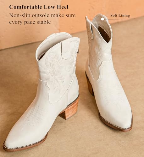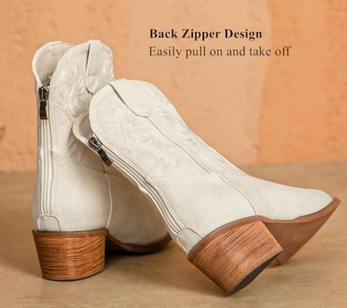 Fabric type: Synthetic LeatherSole material: RubberShaft height: AnkleOuter material: Faux Leather【Trendy Western Cowboy Boots】: Classic hand-embroidered and pointed Toe design, pull-on style, Step back in time to western style! Chic fancy embroidery patterns reflect the elegance. The cowboy cowgirl boots for women are sleek and modern with a classic western design.【Comfy Latex Padded Insole】: These women's cowgirl boots are made with synthetic leather, and a foam padded lining. The lining also allows the boot shaft to retain its shape. Rafted from breathing mesh lining & Cushioned insole the modern cowboy boots provide all-day comfort and stability.【Easy to Put On and Take off】: The wide calf design can be put on and taken off directly, very easy. Casual pull-on boots designed with back zipper. Pull these cute boots on and off without any hassle, The cowgirl boots perfect for pairing with jeans, dresses, shorts, showing off western cowboy style, fashion retro classic.【All-day Comfort】: Chunky heel design provides better support and stability, making you more comfortable while walking. The ankle-calf design protects your ankles well. 1.57 Chunky boots make you feminine without being uncomfortably high, every step you take wearing it will attract all the attention.【Versatile for Any Occasion】: Whether for a party or a casual occasion dressed up or down, they fit in just as well on the ranch as they do on the dance floor. They also look great with jeans, dresses, shorts and more, for all seasons! These cowboy boots will be the best choice for weddings, street style, and everyday wear. Perfect for everyday use. premium materials and excellent craftsmanship ensure long-lasting durability.