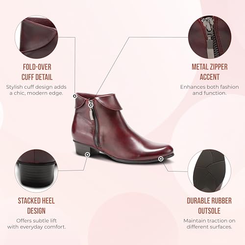 • 𝐌𝐄𝐓𝐀𝐋 𝐙𝐈𝐏𝐏𝐄𝐑 𝐂𝐋𝐎𝐒𝐔𝐑𝐄: straightforward to wear with a fold-over cuff and metal zipper, saving time and effort. These ankle boots combined with n approximately 5" shaft height, strike a balance between fashion and practicality.