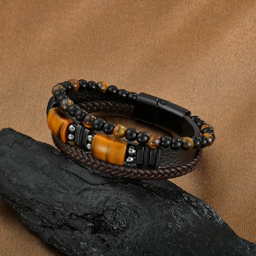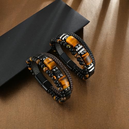 must-have ! Mens Tiger Eye Leather Bracelet, Natural Tiger Eye Stone Beads Multi-Layer Braided Cuff Bracelets for Men, Stainless Steel with Buckle Memorial Bangle Gifts for Him