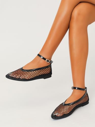 Women's Mesh Ballet Flats Ankle Strap Mary Jane Style Breathable Metal Buckle shoes Summer Casual Daily Dress Fishnet Flats 6