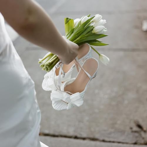 Lovee Cosee Women's Bow Knot Heeled Sandals Pleated Open Toe Ankle Strap Chunky Heels for Bride Wedding