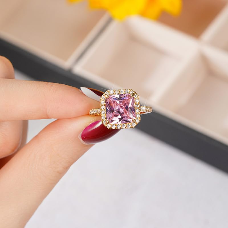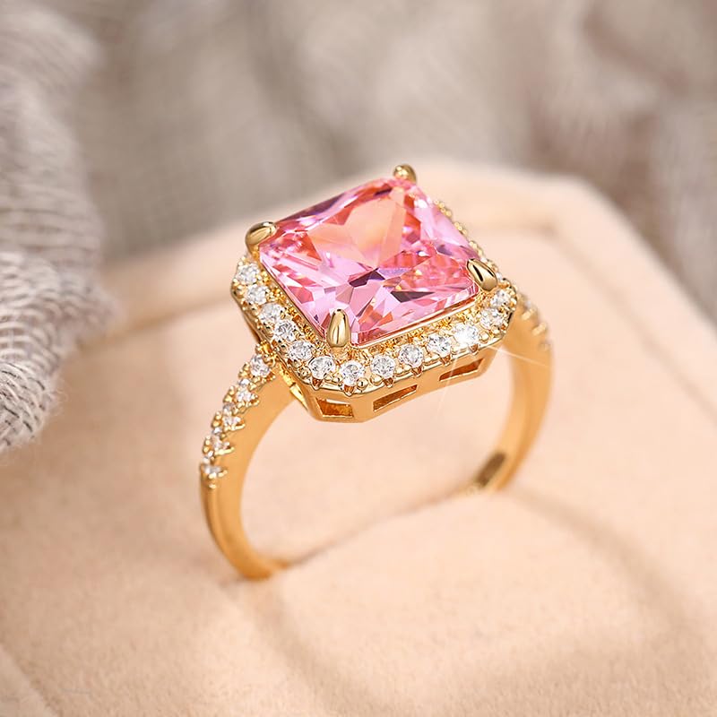 Why Choose Dainty Gold Ring for Women with a Single Coloured Stone, Cute Single Stone Rings for Women, Pink Square Ring for Women Promise Rings CZ Rings, elementary Gold Rings for Women 6?