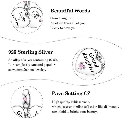 Material: CrystalMetal type: Sterling SilverGem type: Cubic ZirconiaGranddaughter's Love: “All of me Love all of you” and “Lucky to you ”, The words on the Charm inspired her. Let her know that whether you're faced with distance, loss, struggle, or disagreement, your hearts are intertwined for eternity, just like these heart Charms.Fit Bracelet & Necklace: The diameter of the hole is 4.8mm-5.0mm, which can pass through most bracelets, such as fit Pandora Charms Bracelet, Biagi, Troll, and Chamilia European bracelets.Material Qualiry: This double Love Charm is made of 925 Sterling Silver and 5A pink cubic zircon. 925 sterling silver preserves the color, luster, and weight of silver while vastly improving the durability of your Charms.Present for Granddaughter: A flawless Present for granddaughter. The Love Charm is the ideal cute Birthday Present, Christmas Present, graduation Present, or just because of the Present.Customer Service: JIAYIQI Promise 30-days return policy. Questions or concerns regarding the order will be answered within 24 hours. Perfect for everyday use. first-class materials and excellent craftsmanship ensure long-lasting durability.