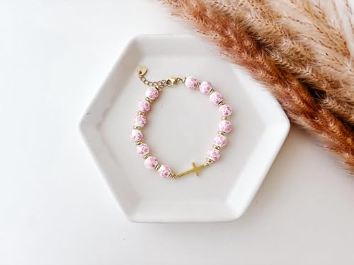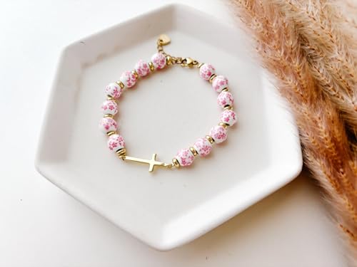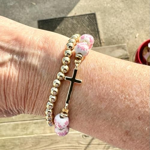 • 【sophisticated and Inspirational】This delicate cross bracelet beautifully merges faith and femininity, featuring elegant porcelain floral beads and a gold-plated cross for a graceful, meaningful look. Accented with gold-plated beads, it adds a touch of vintage-inspired luxury—perfect for everyday wear with timeless charm.