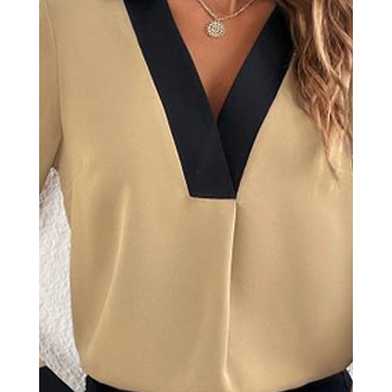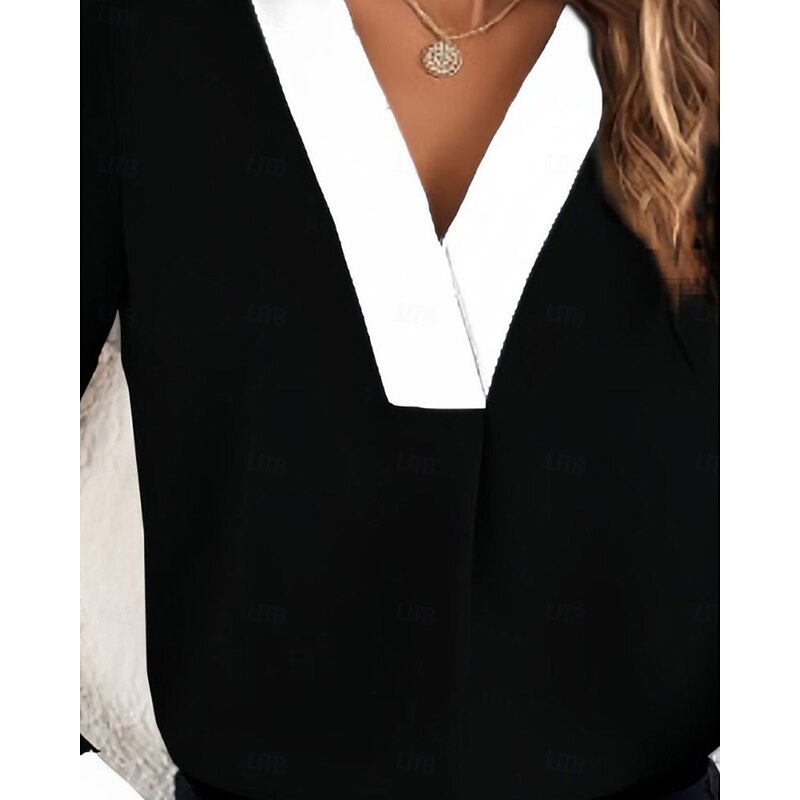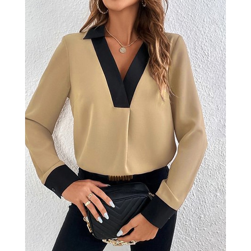Highlights [Fabric]: This women's shirt is crafted from a comfortable blend of spandex and polyester, ensuring a micro-elastic fit that is both lightweight and smooth, making it ideal for spring, fall, and winter seasons. [Fit]: The shirt offers a form-fitting silhouette that enhances a graceful shape while providing ease of movement. The regular top length keeps it versatile for pairing with various bottoms. [Design Highlights]: Featuring a classic shirt collar with contrasting black lapels and matching black cuffs, this blouse embodies modern elegance. The color block pattern adds a contemporary touch to its overall design. [Occasions]: Perfect for work and professional settings, this chic and modern blouse pairs beautifully with tailored pants or a sleek skirt, making it an excellent choice for formal occasions or business meetings. [Size Range]: Available in a wide range of sizes from S to 2XL, catering to various body types and ensuring a perfect fit for different occasions. Perfect for everyday use. supreme materials and excellent craftsmanship ensure long-lasting durability.