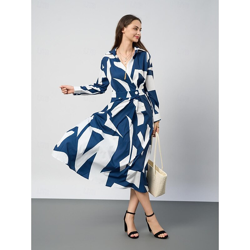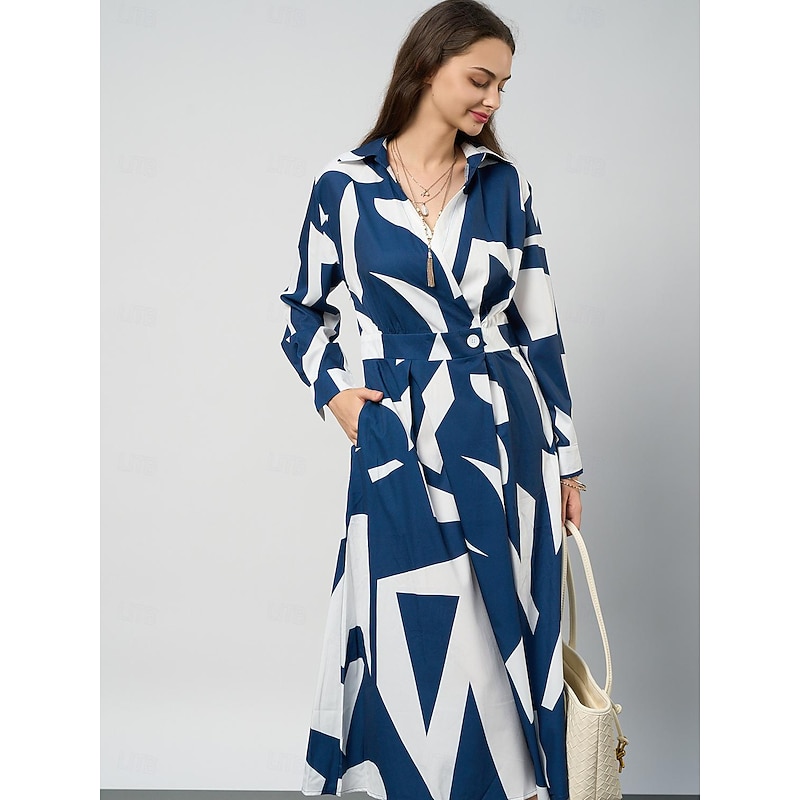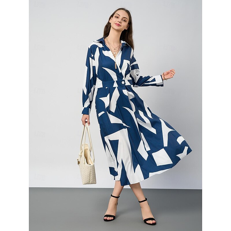 Highlights [Fabric] Crafted from premium polyester, this women's midi dress offers a lightweight and breathable experience, perfect for comfortable all-day wear throughout the spring and fall seasons. The fabric ensures ease of movement, while maintaining a sleek and polished appearance. [Silhouette] The dress features a flattering A-line silhouette that gently flows to a midi length, providing a versatile fit suitable for both office settings and more casual outings. The inelastic nature of the fabric contributes to a sleek, slim fit that accentuates the body's natural lines. [Design Highlights] This modern piece is adorned with a bold blue graphic print, complemented by a classic shirt collar and long sleeves that lend a touch of elegance. The ruched button design at the waist accentuates your figure, while the button accents add a contemporary twist to the overall look. [Occasions] Ideal for office environments and other formal or semi-formal occasions, this dress transitions seamlessly from work to after-hours events. Pair it with heels and statement accessories for a sophisticated appearance or keep it casual with a pair of sleek sandals for weekend gatherings. [Size Range] Available in sizes S, M, L, XL, and XXL, this dress caters to a wide range of body types, ensuring an inclusive fit. This versatile piece can be easily maintained with machine wash, making it as practical as it is fashionable. Perfect for everyday use. supreme materials and excellent craftsmanship ensure long-lasting durability.
