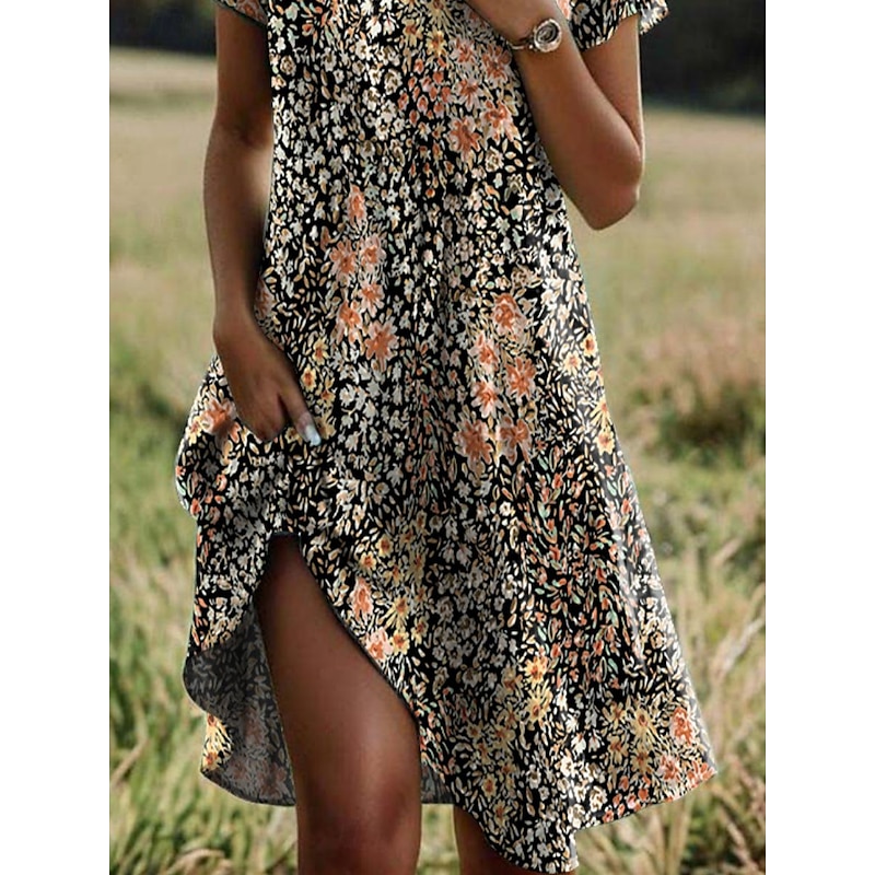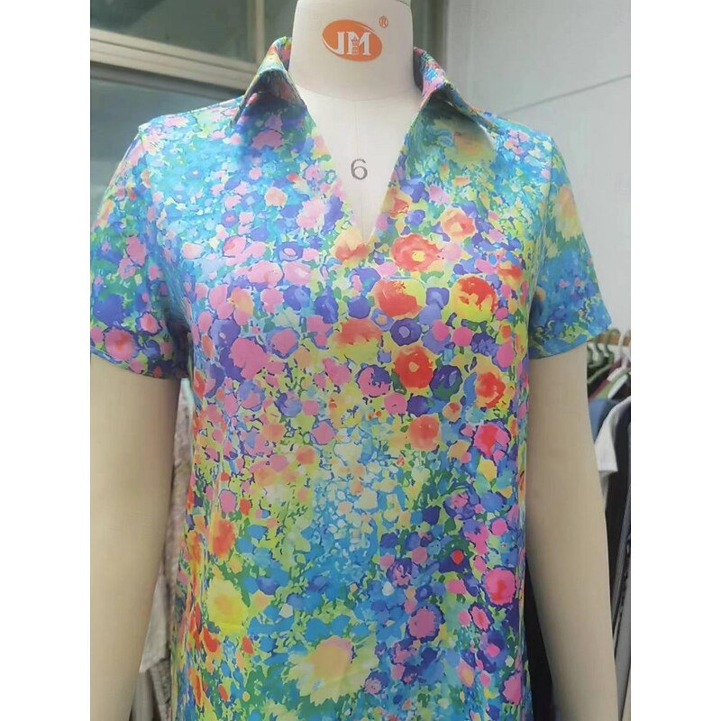 : The dress features a vibrant ditsy floral print in a stunning array of colors including blue, orange, yellow, and pink. The V-neckline paired with a lapel adds sophistication, while the short sleeves offer a comfortable and breezy fit. Its slightly asymmetrical hemline injects a modern touch of elegance.