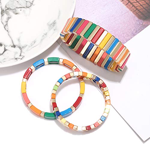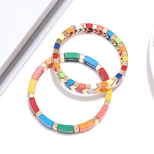 LENOOCLE Rainbow Enamel Tile Bracelet Colorful Enameled Beaded Stretch Bracelet Stackable Color-Block Strand Bracelet Set for Women Men
