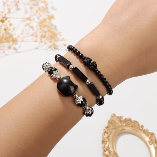 must-have ! 3Pcs Money Attraction Cat Bracelet - Black Obsidian Women Bracelets -Wealth Prosperity Abundance Stone Bead Bracelet,Crystal Spiritual Cute Protection Stretch Bracelet,Good Luck Feng Shui Bracelets For Women Gifts