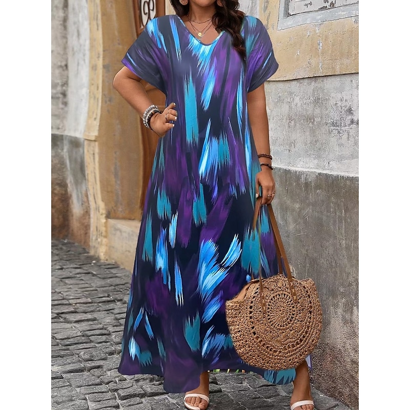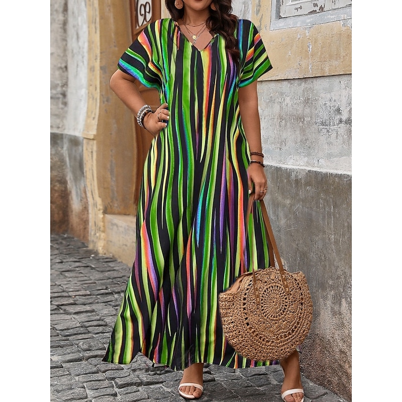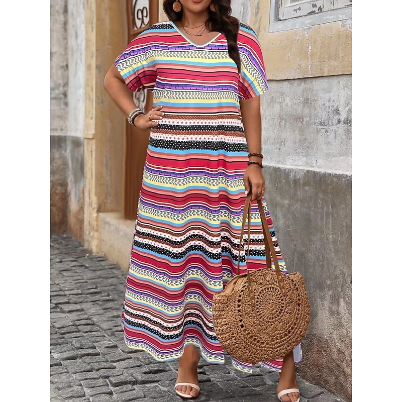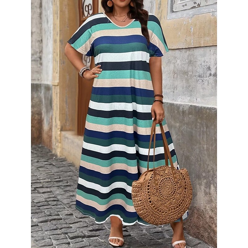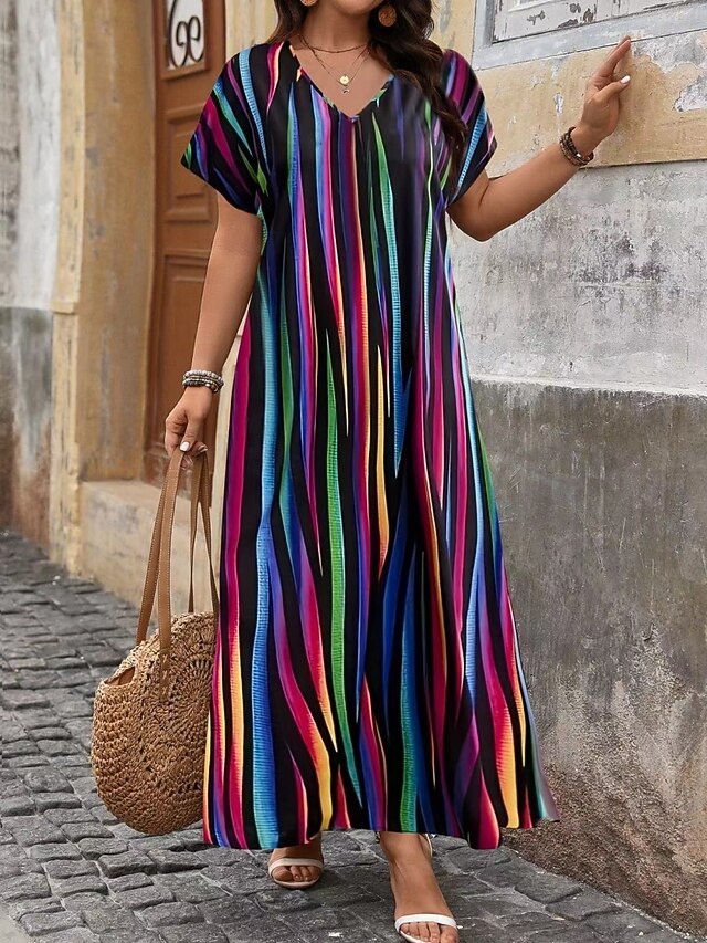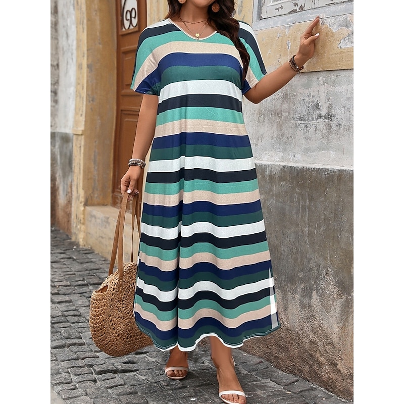 must-have ! Women's Maxi Dress A Line Dress Casual Outdoor Beach Loose Fit Stripe Short Sleeve V Neck Pink Red Blue Purple Summer Spring