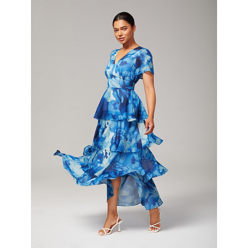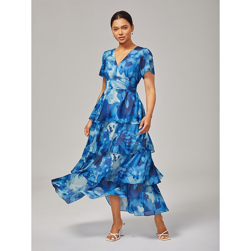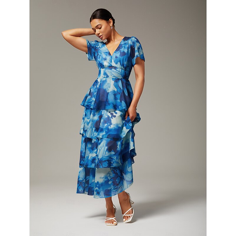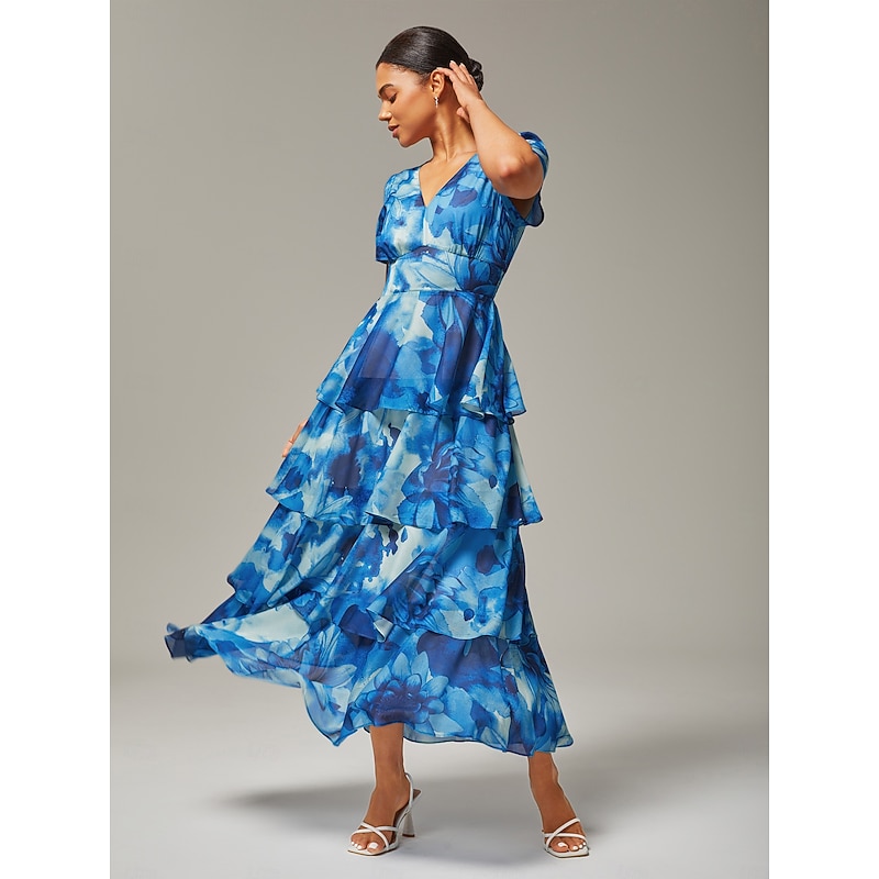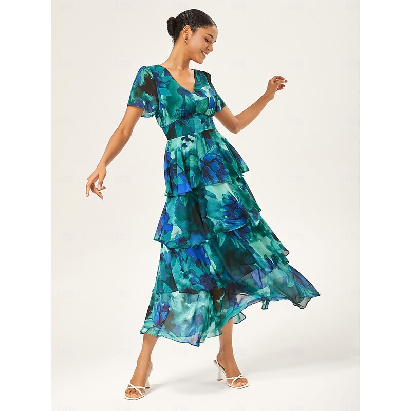 must-have ! Women's Wedding Guest Party Maxi Chiffon Dress V Neck Flowy Multicolor Floral Print Dark Green Vintage Elegant A Line Tiered Ruffle Cake Skirt Waist Slim Fit Elastic Back Dress