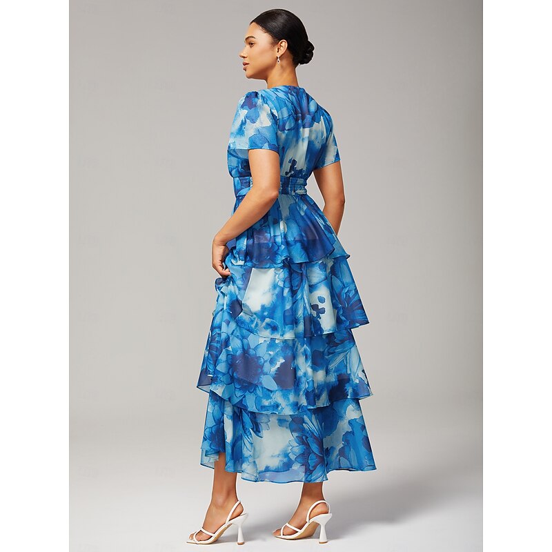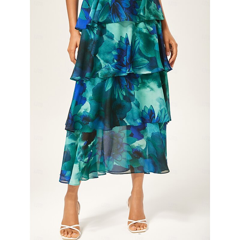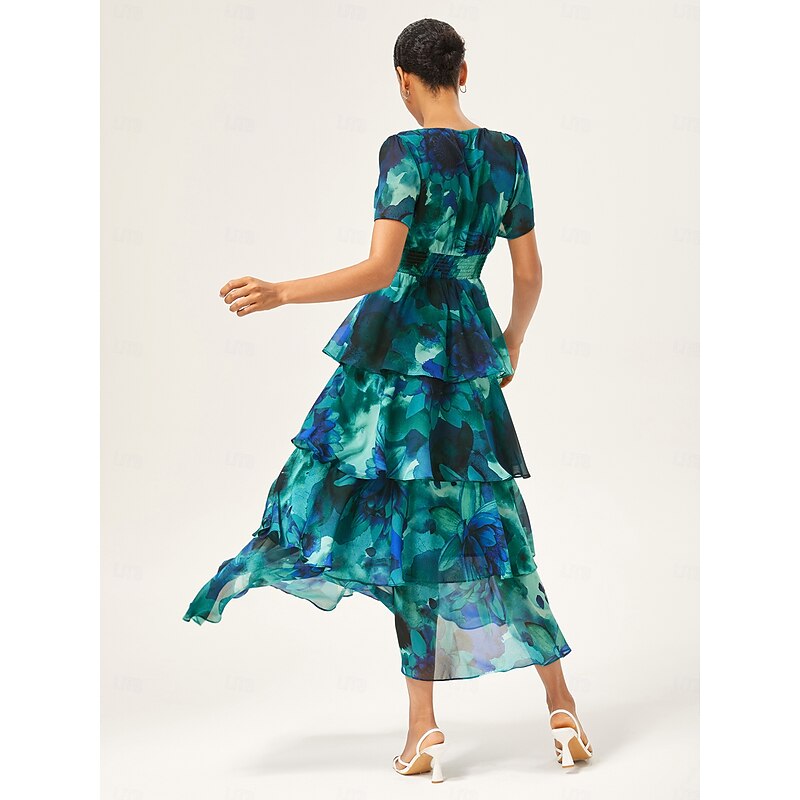 More information about Women's Wedding Guest Party Maxi Chiffon Dress V Neck Flowy Multicolor Floral Print Dark Green Vintage Elegant A Line Tiered Ruffle Cake Skirt Waist Slim Fit Elastic Back Dress