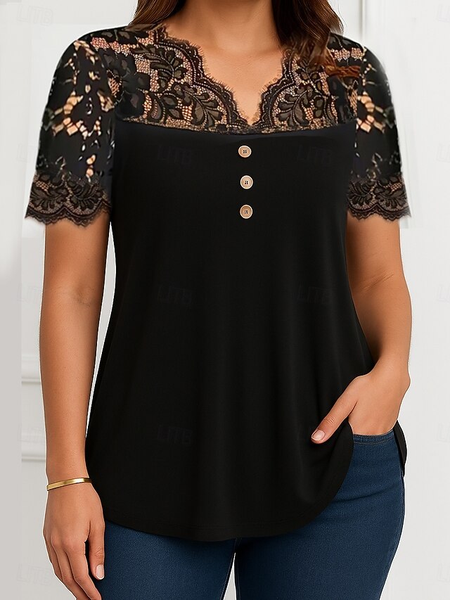 This Women's Lace Shirt Solid Color sophisticated Casual Short Sleeve V Neck Regular Tops Daily Lace Patchwork Buttons Black Wine Purple Summer Spring combines elegant design with practical functionality. Every detail has been carefully considered to ensure you get the best possible experience. The supreme construction means this product will serve you well for years to come.
