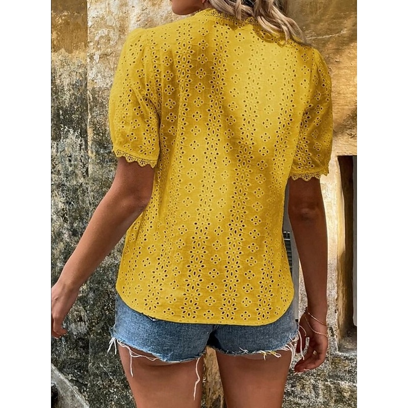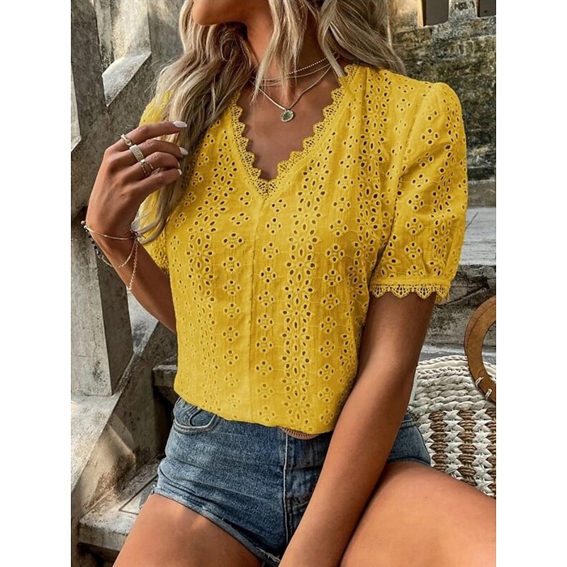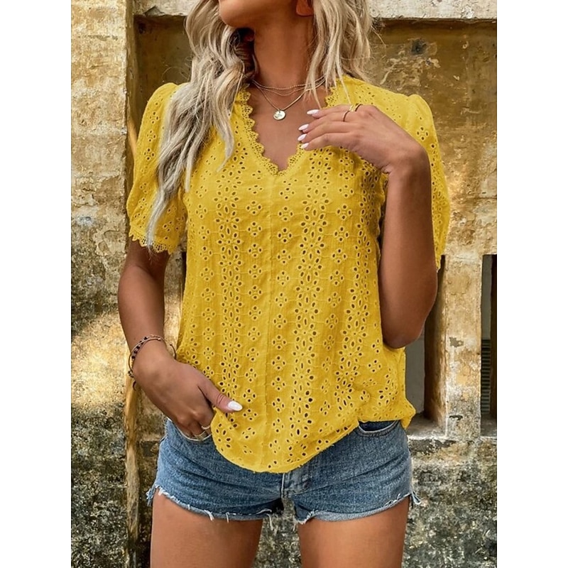 This Women's White Elegant Lace Tops Eyelet Blouse Casual Solid Color Regular Tops Short Sleeve V Neck Lace Eyelet Regular Fit Daily White Yellow Romantic Petite Tops Summer Holiday Wear combines elegant design with practical functionality. Every detail has been carefully considered to ensure you get the premier possible experience. The premium construction means this product will serve you well for years to come.