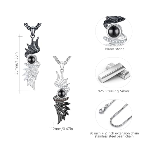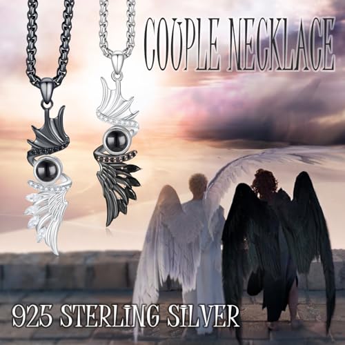 Material: Sterling SilverMetal type: Sterling SilverClasp type: LobsterChain type: BoxGem type: Cubic ZirconiaAngel Wings Necklace Design: Wings necklace is a unique and meaningful necklace, usually designed and made with wings as the theme. In many cultures and religions, wings symbolize freedom, hope, happiness and spirituality, so wings necklaces are often regarded as amulets or mascots. It means to become the wings of an angel and protect you for a lifetimeI Love You Necklace: How romantic! With a projection necklace, you will see I love you in 100 different languages! This heart-shaped couple necklace is suitable for two people in love, and the necklace is engraved with I love you in 100 different languages. Bring the pendant close to your eyes to discover the hidden secretsCouple Necklace Material and Size: The couple necklace is made of 925 sterling silver, paired with projection stones to make it truly eye-catching. Inlaid with sparkling zircon. Lead-free and nickel-free, hypoallergenic, safe for sensitive skin. Angel Wings Pendant Size: 1.38*0.47in/35*12mm, Stainless Steel Chain Length: 20+2 inches extension chainCouple Gift: Comes with a gorgeous gift box. The token of love given between lovers symbolizes their love for each other and makes their love last forever. This angel wing necklace and couple necklace is the best proof of your loveCustomer Service: Whether it's about a product, an order, or anything else, we're here to help. We believe communication is key and strive to respond to all inquiries promptly and professionally Perfect for everyday use. first-class materials and excellent craftsmanship ensure long-lasting durability.