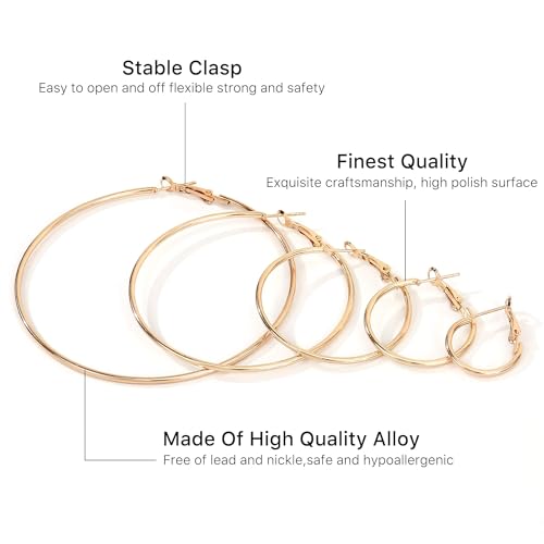 Material: Alloy SteelMetal type: Yellow GoldBack Finding: Snap BackEarring design: HoopGem type: No GemstoneItem type name: Hoop EarringsHoop Earrings for Women : 12 pairs gold and silver hoop earrings set for women whick one order includes 6 sizes (25mm/35mm/45mm/55mm/65mm/75mm). The size can be mixed and matched with other hoop earrings. Each pair of hoop earring is trendy and lightweight, and this pair of earrings shows the perfect combination of elegance and fashion.When worn, it can modify the face shape well and show the femininity and confidence of women.Hypoallergenic Earrings for Women : Our large hoop earrings for women are made of high-quality alloy steel. They are lead-free, nickel-free, and hypoallergenic. We have done a lot of work to prevent hypoallergenic and color oxidation. Especially in the color of the earrings, we have invested a lot of energy to make the color of the hoop earrings last longer.Trendy Gold Hoop Earrings Set for Women: Wearing this gold hoop earrings for women not only makes people feel comfortable and happy, but also brings a sense of surprise and excitement. Its beauty is like inlaying the vast galaxy on the ear, making people immersed in romance and fantasy. It not only enhances personal charm and self-confidence, but also attracts the admiration and envy of people around.Gift Big Hoop Earrings for Women : Women's hoop earrings multipack which order contains 6 sizes. Perfect earrings are gifts for women, gifts for wife or mom, suitable for birthdays, Valentine's Day, anniversaries, Mother's Day, Christmas and friends gatherings.Satisfaction Guaranteed : Your happiness is our number one priority. We are committed to providing you with the highest quality products and best services.Please contact us if you have any questions after receiving the item. Perfect for everyday use. first-class materials and excellent craftsmanship ensure long-lasting durability.
