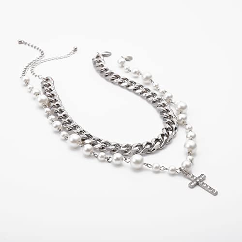 Pearl Cross Necklace for Women Silver Layered Crystal Cross Pendant Punk Chain Choker Necklace Dainty Jewelry