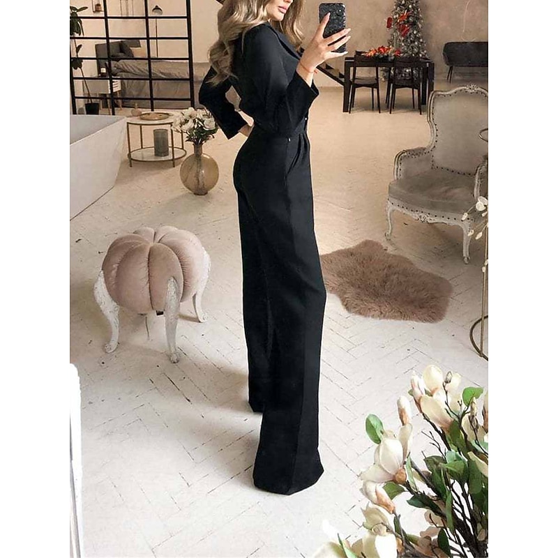 Highlights [Fabric] : Crafted from a blend of cotton and polyester, this women's jumpsuit provides both comfort and durability. The micro-elasticity of the fabric allows for a form-flattering fit while maintaining ease of movement, making it a versatile option for various occasions. [Silhouette] : The jumpsuit features a regular fit with a high waist design that cinches at the smallest part of the waist, naturally accentuating the wearer's shape. The slightly relaxed wide-leg cut elongates the silhouette, adding elegance to the overall aesthetic. [Design Highlights] : This sophisticated piece includes practical side pockets that enhance functionality without sacrificing style. A v-neckline and a notched lapel collar lend a formal touch, reminiscent of vintage blazer styles, and combine with long sleeves to create a refined appearance perfect for formal settings. [Occasions] : Ideal for a wide range of events, from business meetings and office work to streetwear styling and elegant social gatherings. The jumpsuit's classic black, white, and wine color options ensure it fits seamlessly into any wardrobe and suits various settings with ease. [Size Range] : Available in sizes S, M, L, and XL, this jumpsuit caters to a variety of body types, ensuring a plush and flattering fit for everyone.