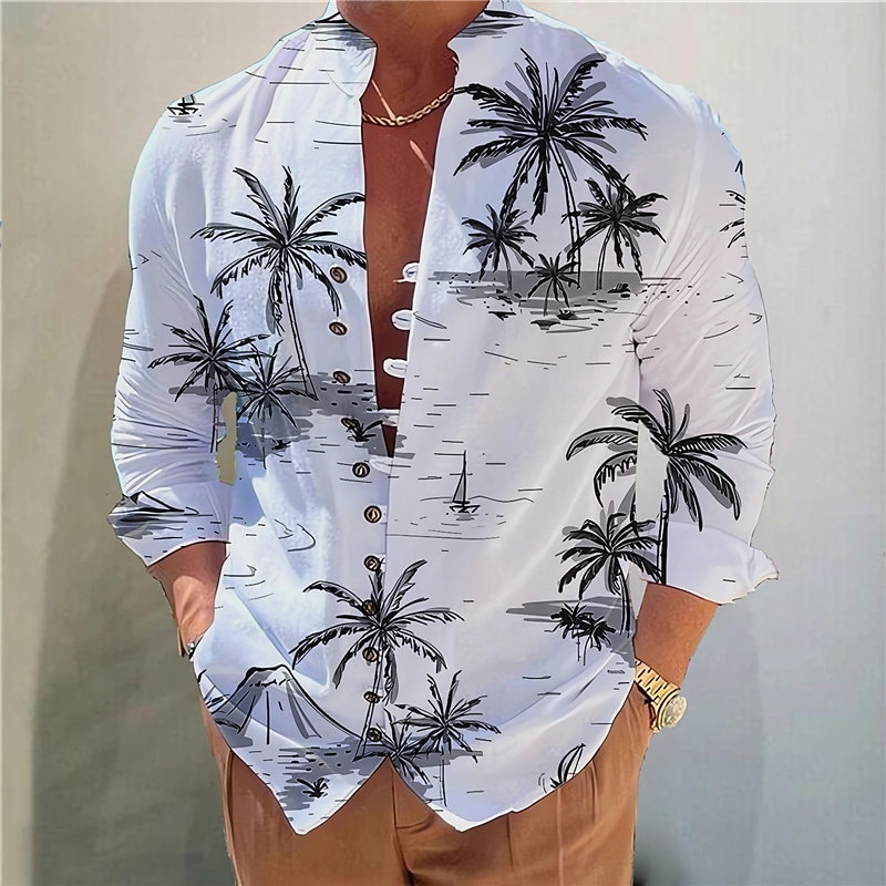 Highlights [Fabric] Crafted from a lightweight and breathable polyester fabric, this men's shirt offers a cushy, micro-elastic fit, making it perfect for warmer climates and all-day wear. [Fit] Designed with a regular fit, this shirt combines tailored sophistication with relaxed comfort, making it suitable for casual outings and evening gatherings alike. [Design Highlights] Featuring a vibrant print of coconut trees and tropical plants, this shirt captures the essence of a seaside escape. It boasts a stand collar and long sleeves with a button-down front, allowing for versatile styling options. The sleeves can be rolled up for a laid-back, elegant touch. [Occasions] Ideal for vacations, street style, daily casual wear, or outdoor adventures, the shirt's tropical vibe makes it a standout piece for Hawaiian-themed events or relaxed weekend getaways. [Size Range] Available in sizes S, M, L, XL, 2XL, and 3XL, this shirt caters to a wide range of body types, ensuring a perfect fit for everyone. Perfect for everyday use. premium materials and excellent craftsmanship ensure long-lasting durability.