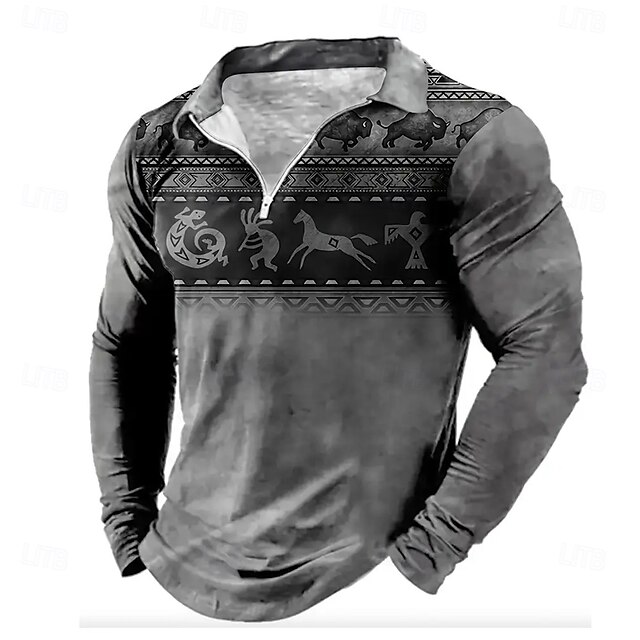 Why Choose Men's Graphic Polo Long Sleeve Vintage Casual Daily Vacation Causal Zipper 3D Print Spring Fall Winter ash-colored?
