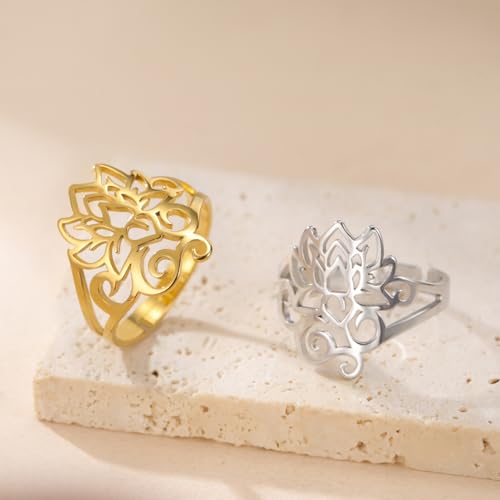 Ring size: AdjustableMaterial: Stainless SteelMetal type: No Metal TypeGem type: No GemstoneLotus Flower Ring: The Lotus flower is a symbol of purity, enlightenment, self-regeneration and rebirth. The lovely lotus blooms on the surface of stagnant water; its roots grow in the muddy depths. This symbolises our ability to transform great struggles and difficulties into powerful life lessonsMaterial: Made of stainless steel, perfectly polished, beautifully shiny and pleasant to the touch, durable and will not fadeSpecification: Adjustable size to fit most fingers; Width: 18mm; Weight: 1.8g,You can check out the fourth image of our main picture, which is the sizing chart for our productsPerfect Choice: It's a best choice for your friend, family members, co-worker and yourself too; Also suitable for special days and daily lifeOccasions: Our product is suitable for you to attend special occasions such as, wedding, birthday party, prom. This Fashion Women jewelry will enhance your look besides decorate your beautiful mood and attract great attentions Perfect for everyday use. premium materials and excellent craftsmanship ensure long-lasting durability.
