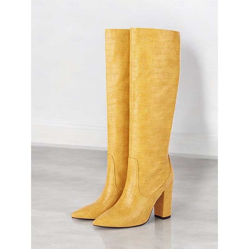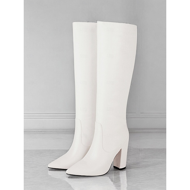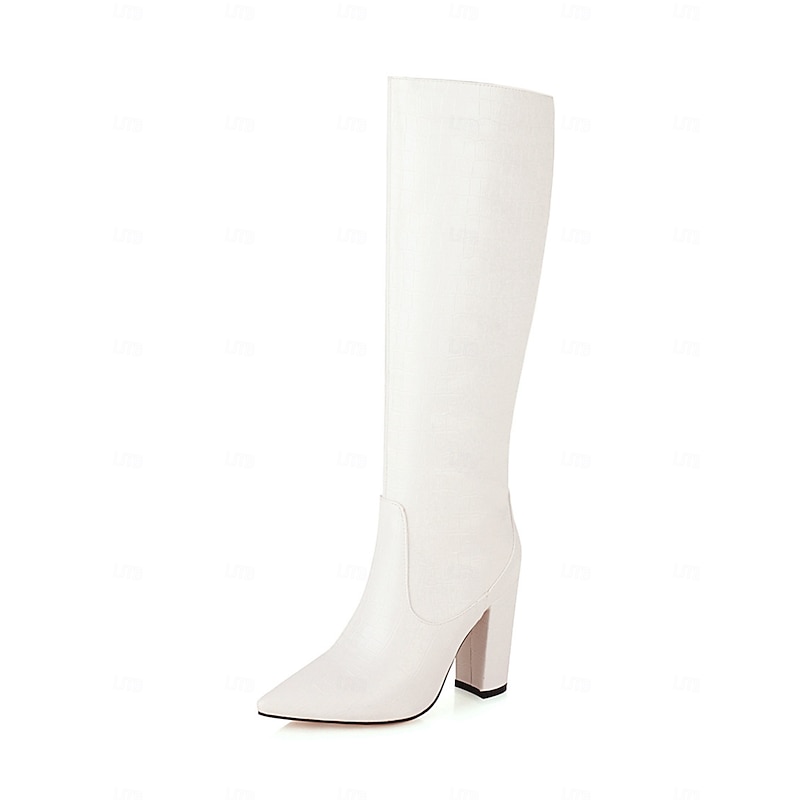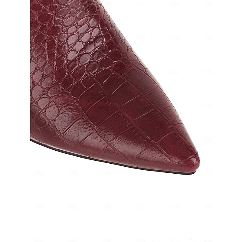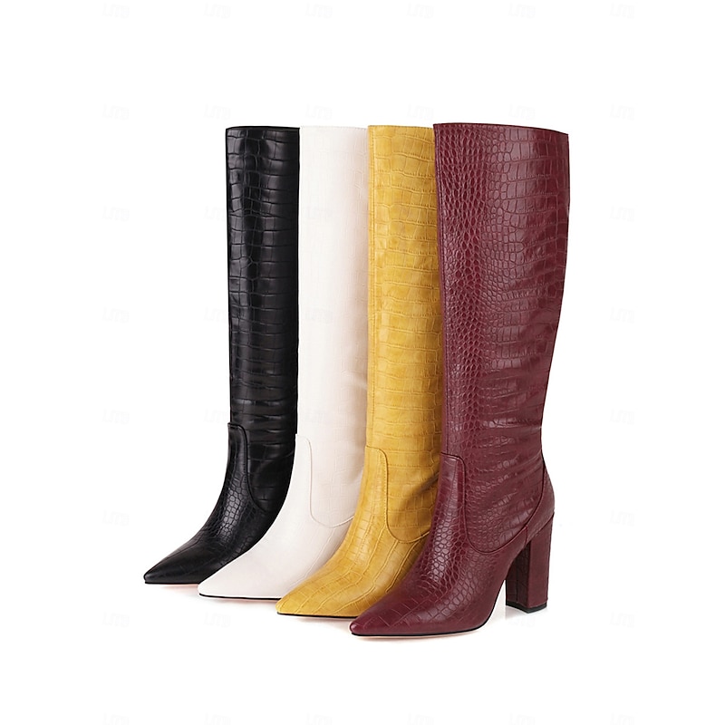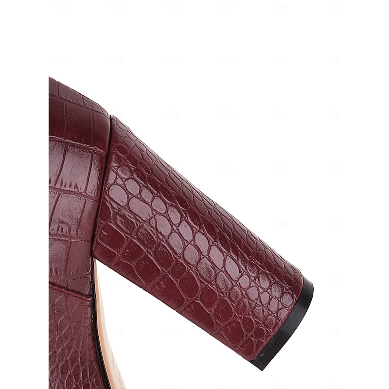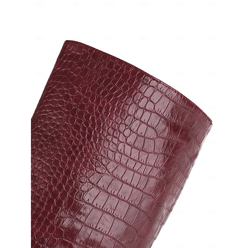 Highlights [Product Highlights] Burgundy Croc-Embossed Knee-High Boots for Women [Fabric]: These knee-high boots are crafted from high-quality faux leather with a luxurious crocodile-embossed texture, providing a sophisticated and chic appeal. [Fit]: The pointed-toe design and sturdy block heel offer a stylish silhouette combined with comfort for all-day wear. The high shaft ensures a flattering fit that pairs well with various outfit styles. [Design Highlights]: The boots showcase an elegant pointed toe and a chunky block heel, enhancing both the aesthetic and practicality. The slip-on design adds ease of use, while the rich burgundy hue complements fall and winter wardrobes beautifully. [Occasions]: Perfect for work, office settings, and casual outings, these boots are a versatile choice for the fall and winter seasons. They pair effortlessly with leggings, skirts, or skinny jeans, making them a fashion staple. [Size Range]: Available in sizes US5.5 to US10.5, accommodating a broad range of foot sizes while ensuring a comfortable fit for most wearers. Perfect for everyday use. supreme materials and excellent craftsmanship ensure long-lasting durability.