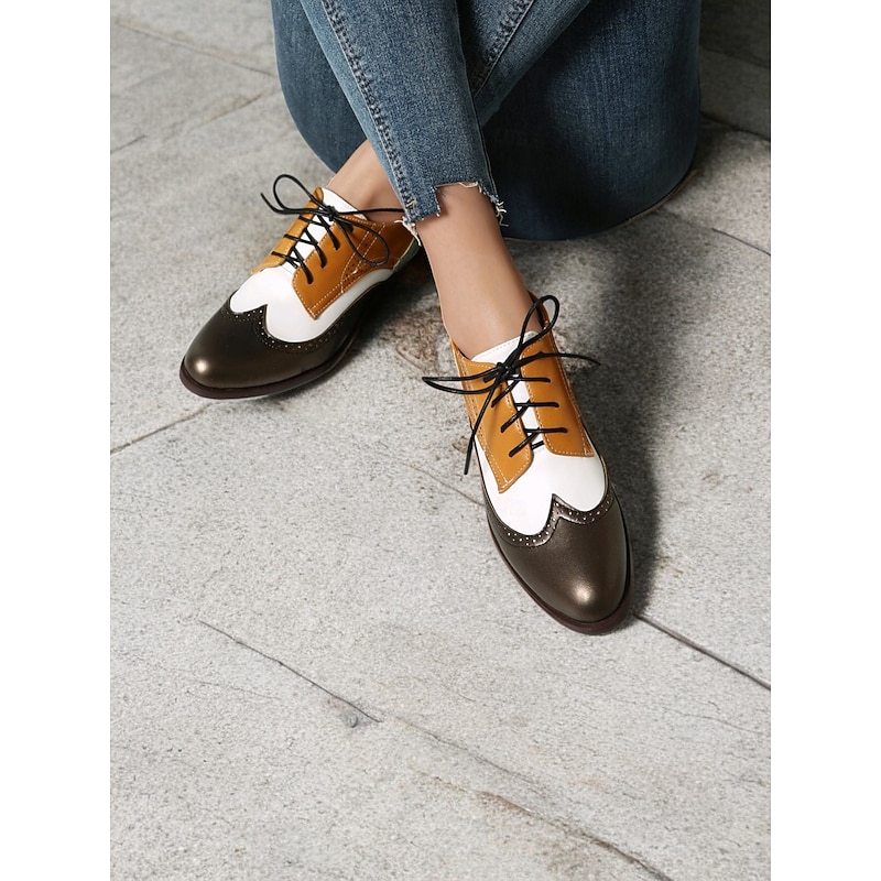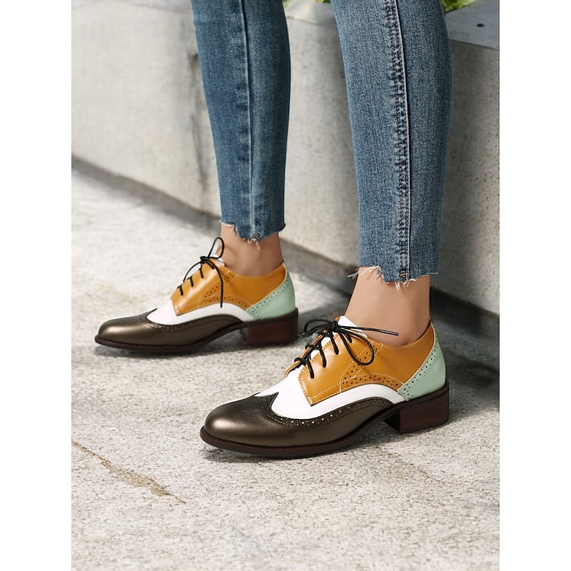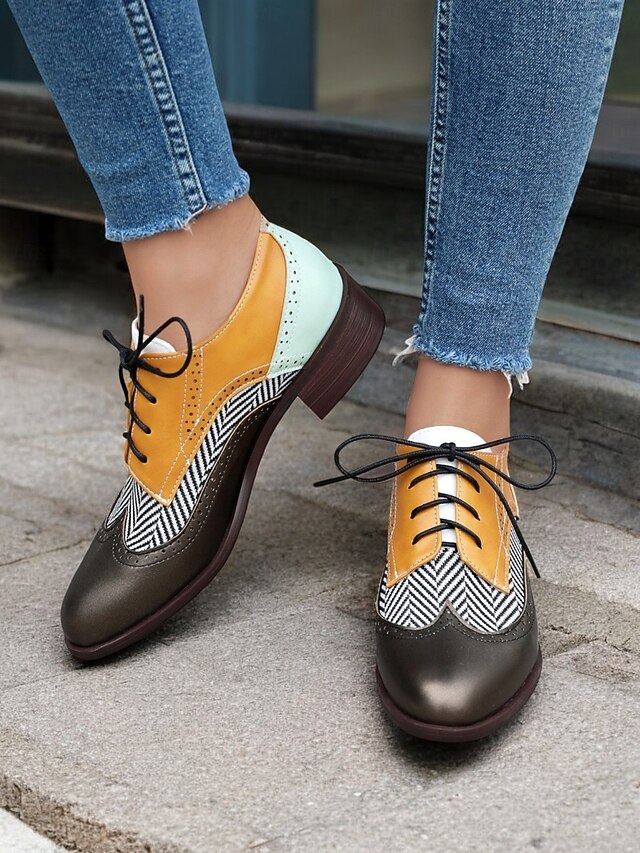 must-have ! Women's Multicolor Brogue Oxford Shoes with Chevron Pattern and Contrasting Faux Leather Panels – Vintage-Inspired Lace-Up Flats