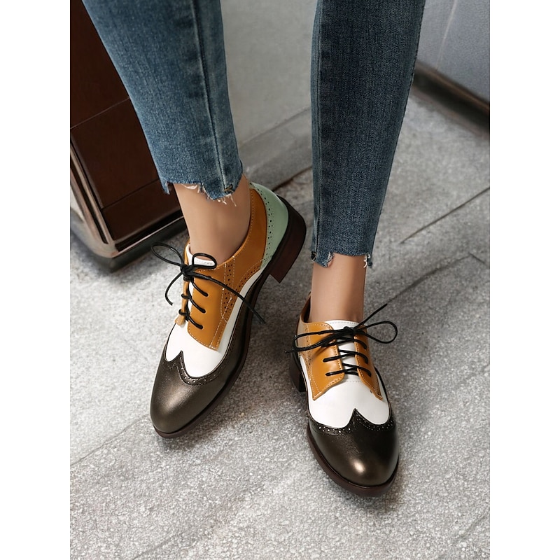 Highlights [Fabric and Material] : Crafted with an upper made from high-quality PU and lined with synthetic leather, these Women's Multicolor Brogue Oxford Shoes ensure both durability and comfort. The rubber outsole provides excellent traction, making them a reliable choice for various surfaces. [Style and Fit] : These lace-up flats combine classic oxford styling with a vintage-inspired twist. Featuring a round toe and chunky heel, they offer a comfortable fit ideal for daily wear. The contrasting faux leather panels in a modern plaid and color block pattern enhance their one-of-a-kind appeal. [Design Highlights] : The shoes boast a vibrant chevron pattern across the midsection, paired with sleek black leather toe caps and mustard-yellow accents for a bold visual impact. Mint green detailing at the heel introduces a refreshing element, while black laces secure the design perfectly. [Suitable Occasions] : Ideal for both casual and semi-formal settings, these brogue shoes are the perfect choice for work, daily errands, or any event where you want to make a statement with your footwear. Their versatile style allows them to complement a variety of outfits. [Size Range] : Available in a wide size range, you can find the perfect fit from US5.5 to US10.5, accommodating European sizes 35 to 42. Choose your standard size for a secure and comfortable fit.