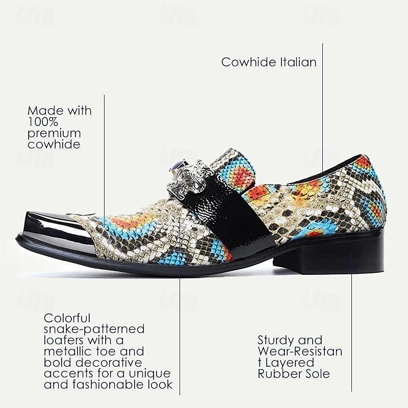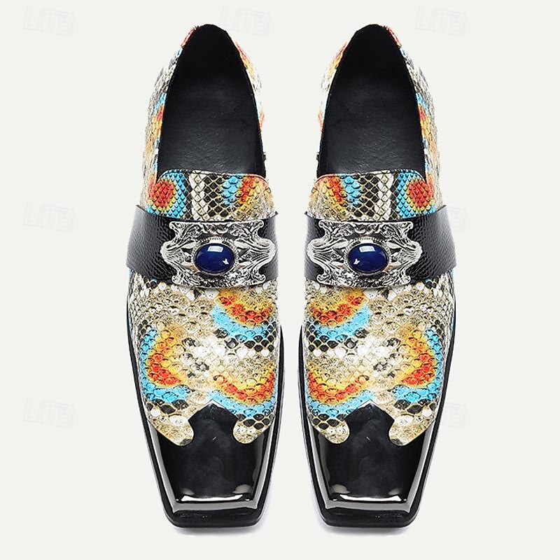 Highlights [Fabric] : Crafted from 100% premium Italian full-grain cowhide leather, these loafers offer an exquisite look and durable wear. The high-quality leather is complemented by a leather lining, ensuring comfort and breathability for the foot. [Fit] : These loafers are designed as a slip-on style with a comfortable and slip-resistant fit. The square toe shape and rubber outsole offer both style and practicality, making them ideal for extended wear at formal events. [Design Highlights] : Featuring a vibrant and embossed color block pattern that resembles snakeskin, these dress shoes stand out with their exotic appearance. The polished black patent leather strap is adorned with striking silver-toned metallic details, including a blue stone accent, and the shoe's distinctive metallic toe cap adds a new-age and sophisticated touch. [Occasions] : Perfect for making a statement at formal events, such as weddings, galas, or upscale parties, these loafers enhance your attire with their luxurious materials and intricate design elements. [Size Notice] : Available in a range of sizes from US6 to US13 (EU39 to EU46), these shoes cater to a variety of foot sizes. Be sure to choose the size that best fits your needs for optimum comfort and style. Perfect for everyday use. first-class materials and excellent craftsmanship ensure long-lasting durability.