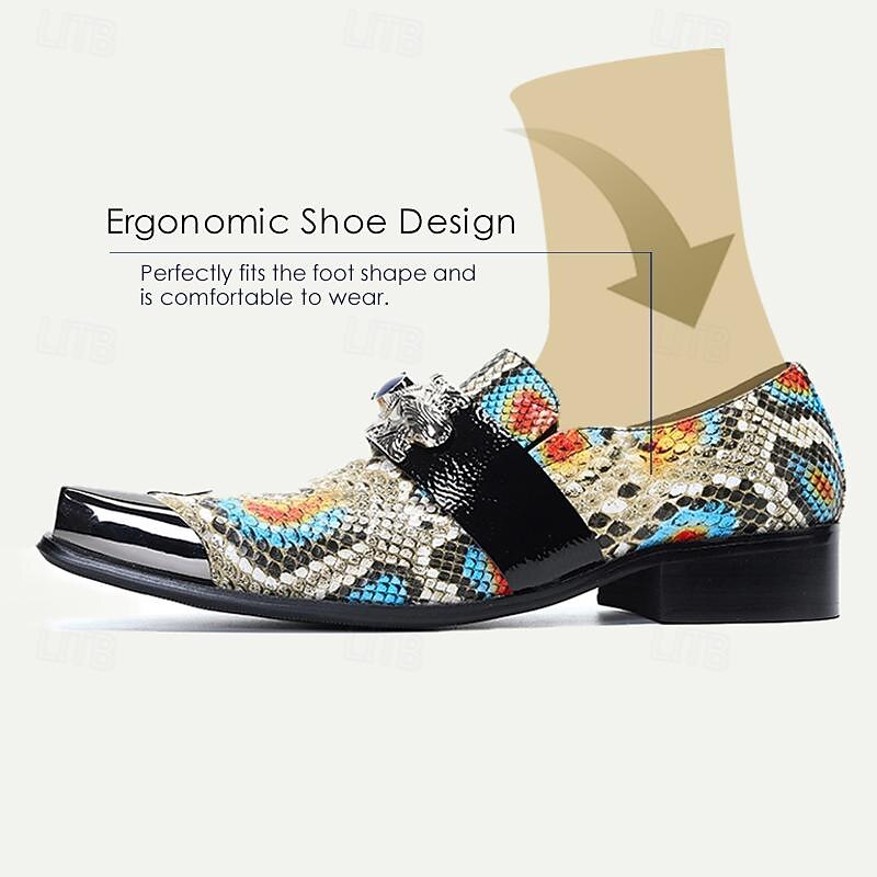 Men's Premium Cowhide Leather Exotic Pattern Loafers - trendy Slip-On Dress Shoes with Decorative Buckle and Metal Toe Cap