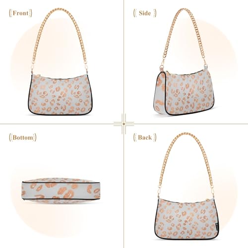 Rose Gold Leopard Spots White Tote Handbag Womens Aesthetic Shoulder Bag Hobo Clutch Purse Zipper Closure Chain Strap 1