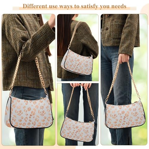 must-have ! Rose Gold Leopard Spots White Tote Handbag Womens Aesthetic Shoulder Bag Hobo Clutch Purse Zipper Closure Chain Strap