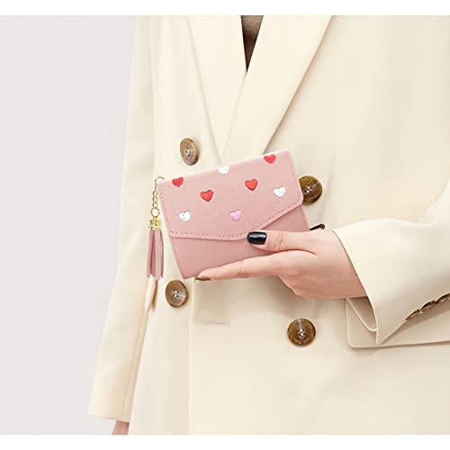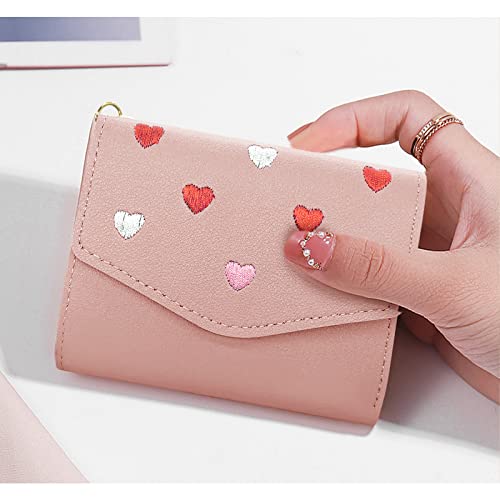must-have ! FuninCrea Ladies Purse Wallet, Small PU Leather Women’s Wallet, Three-fold Ladies Purse with 8 slots, Fashion Coin Purse with Embroidery Heart Pattern for Cash, ID Card, Credit Card (pink)
