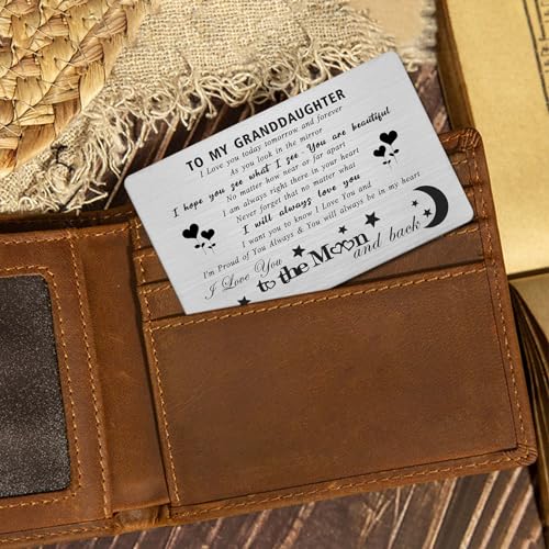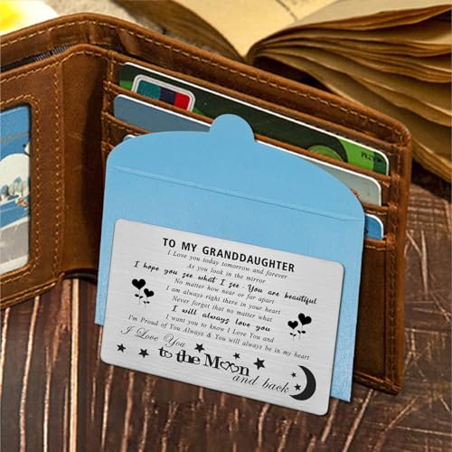 My Granddaughter Wallet Card - The card means love that will last forever. Whether it's a Birthday, Valentine's Day, Mother's Day, Christmas, Graduation or any other meaningful holiday, with this wallet card, you can directly express your love for your granddaughterStainless Steel Wallet Card - A card with Laser Engraved which is both sturdy and unbreakable, and the laser engraving process makes the words on the card last a lifetimeFits In The Wallet Easily - 3.35 x 2.13 x 0.02 inches approximately the size of a credit card. So this card takes up little space and can be easily stored in the walletEnvelope Included - Packaged with a mini cute envelope, easy to share your loveI Love My Granddaughter Gifts - To My Granddaughter, I love you today tomorrow and forever. As you look in the mirror, I hope you see what I see - You are stunning. No matter how near or far apart, I am always right there in your heart. Never forget that no matter what I will always love you. I want you to know I Love You and I'm proud of you always and you will always be in my heart. I Love You to the MOON AND BACK Perfect for everyday use. supreme materials and excellent craftsmanship ensure long-lasting durability.