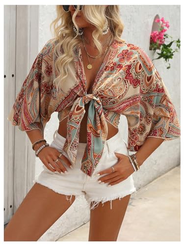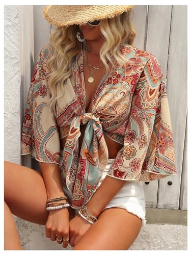 must-have ! GORGLITTER Women's Boho Tie Front Crop Tops 3/4 Length Sleeve Paisley Blouse Shirt