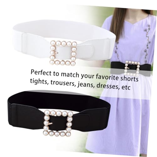 Ladies Elastic Pearl Waist Belt with Square Buckle Simple Cummerbund Skirt Ornament for Dresses and Outfits White 2