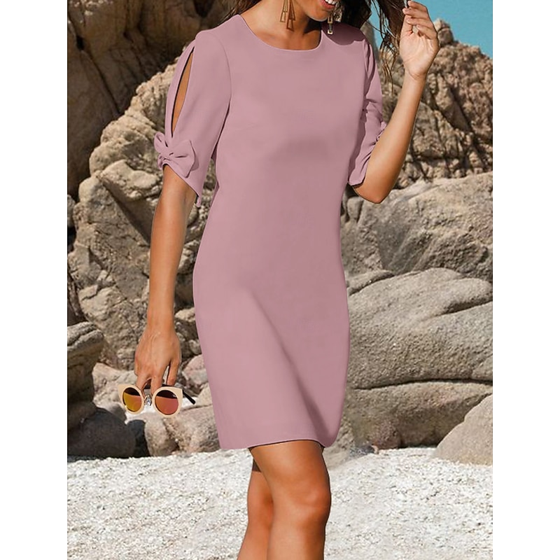 Highlights [Fabric] : Crafted from high-quality chiffon, this dress offers a lightweight and breathable feel, ideal for staying comfortable in warmer climates. The chiffon fabric gives this dress a delicate and airy texture, perfect for any sophisticated event. [Silhouette] : Designed in a classic sheath silhouette, this dress provides a streamlined and flattering fit that gracefully follows the body's natural curves. The jewel neckline and short sleeves enhance this dress's timeless elegance, making it suitable for various occasions. [Design Highlights] : The standout design feature of this dress is the slit sleeves complemented by tied bows, which add a playful and feminine touch to its elegant structure. The knee-length hemline ensures both comfort and sophistication, suitable for day-to-night transitions. [Occasions] : This versatile dress is ideal for wedding parties, serving as an elegant option for wedding guests and semi-formal gatherings. Its simple yet chic design makes it a fitting choice for occasions ranging from casual events to more dressy affairs. [Size Notice] : Available in a wide range of sizes from US 0 to US 26W, this dress caters to diverse body types. Also available are custom measurements to ensure the perfect fit, providing tailored options that accommodate special sizing needs.