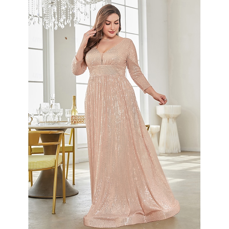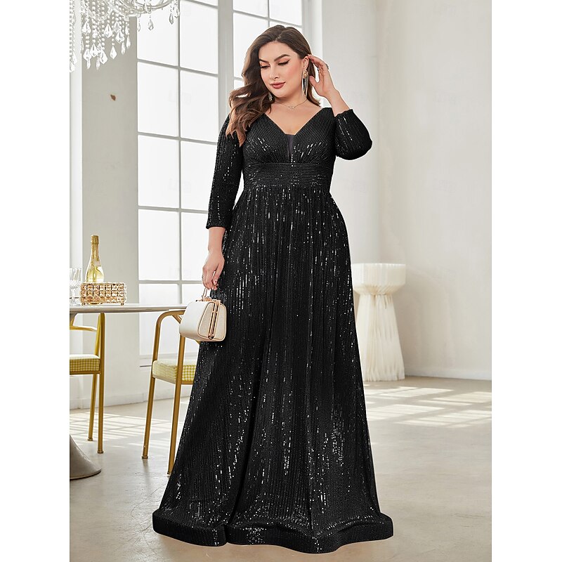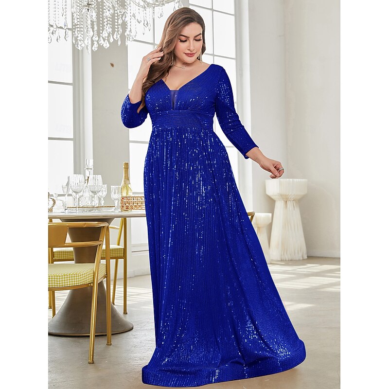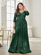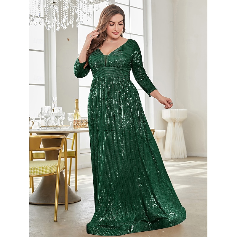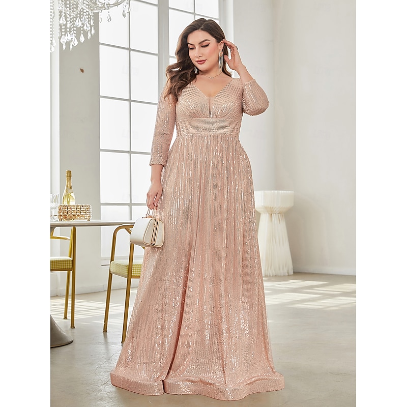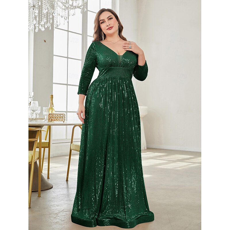 must-have ! A-Line Party Dresses Elegant Dress Formal Floor Length Long Sleeve V Neck Fall Wedding Guest Sequined with Glitter Sequin
