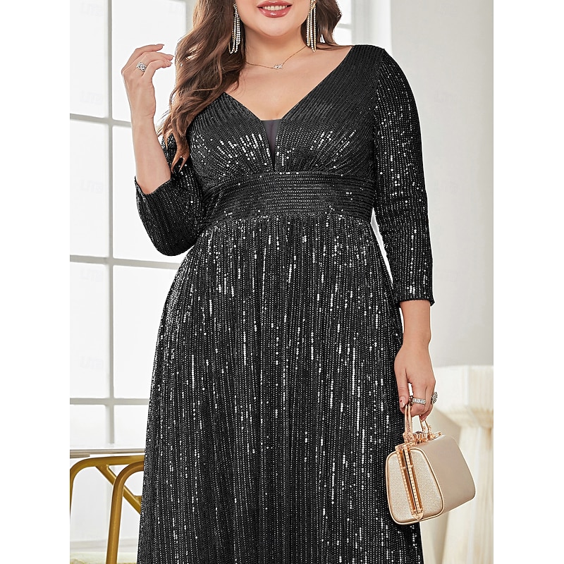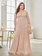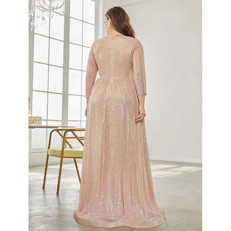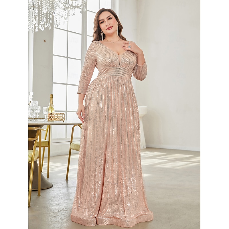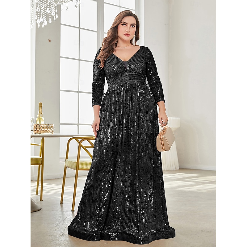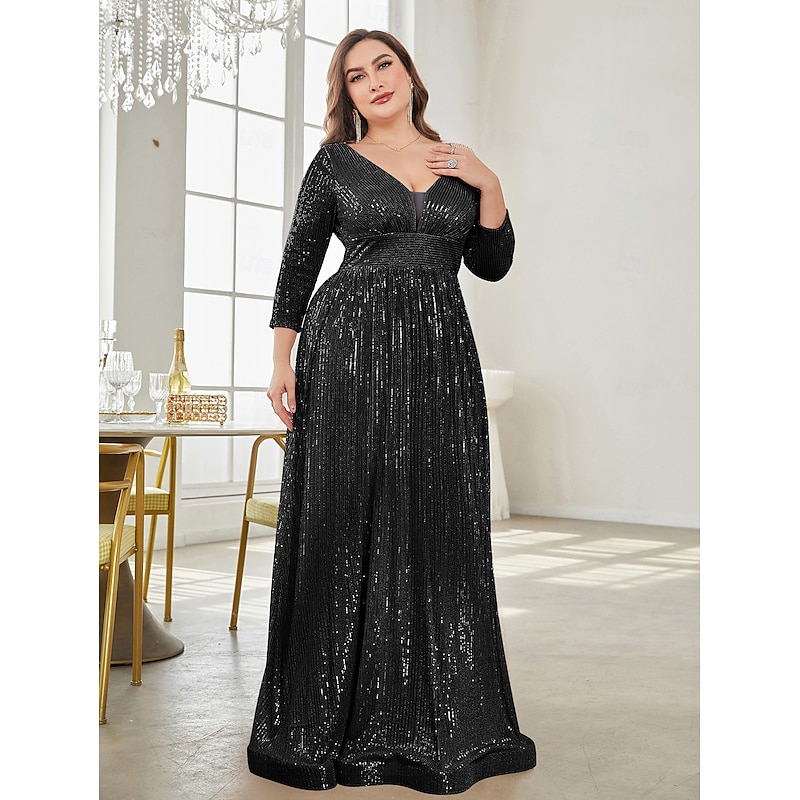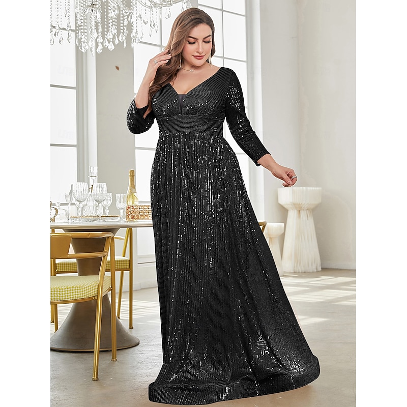 must-have ! A-Line Party Dresses Elegant Dress Formal Floor Length Long Sleeve V Neck Fall Wedding Guest Sequined with Glitter Sequin
