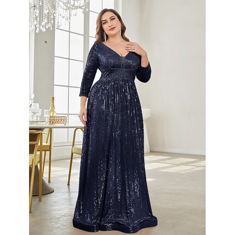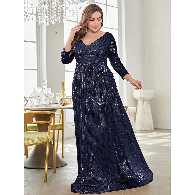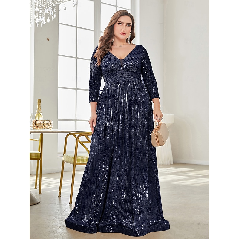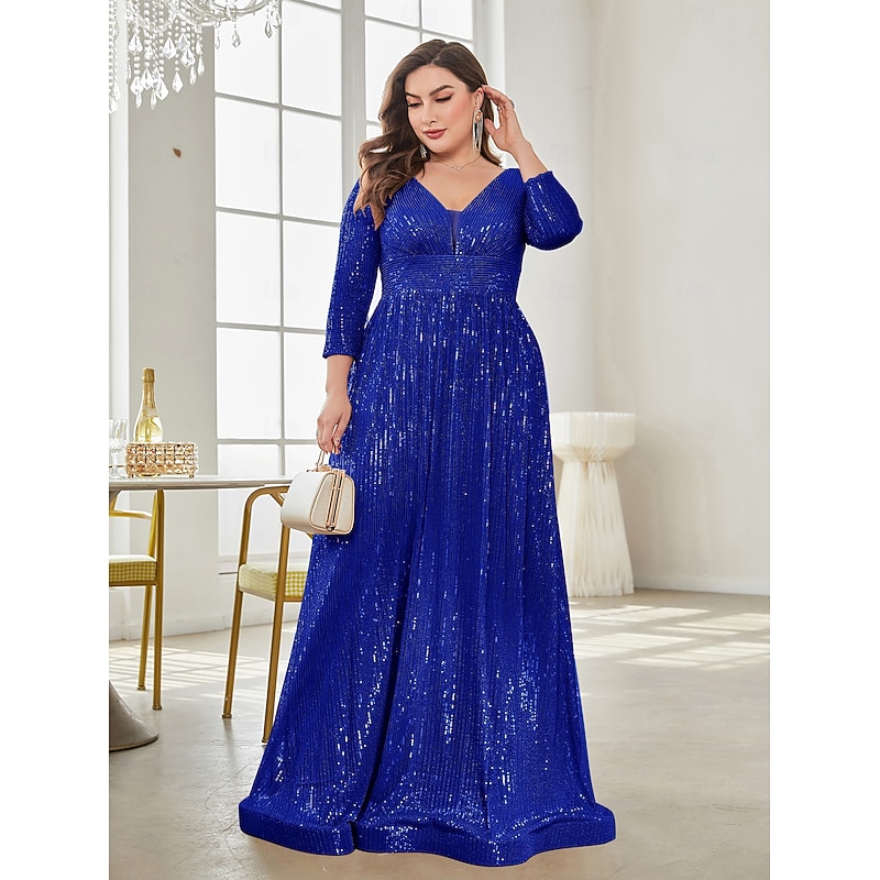 A-Line Party Dresses Elegant Dress Formal Floor Length Long Sleeve V Neck Fall Wedding Guest Sequined with Glitter Sequin 1