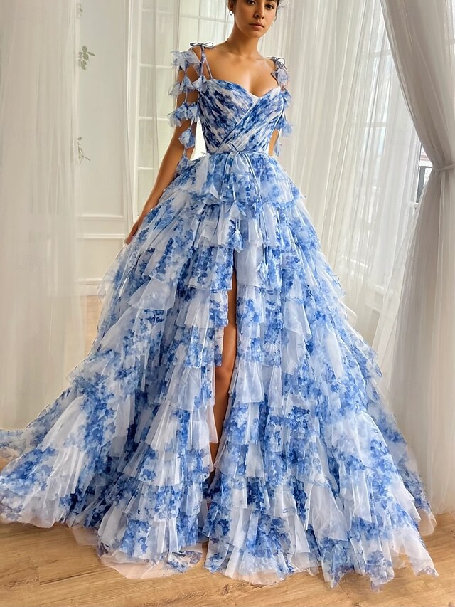 More information about A-Line Prom Tiered Dresses Corsets Dress Semi Formal Wedding Floor Length Sleeveless Sweetheart Dress Organza Floral Print Ruched Details With High Slit Wedding Guest Dress