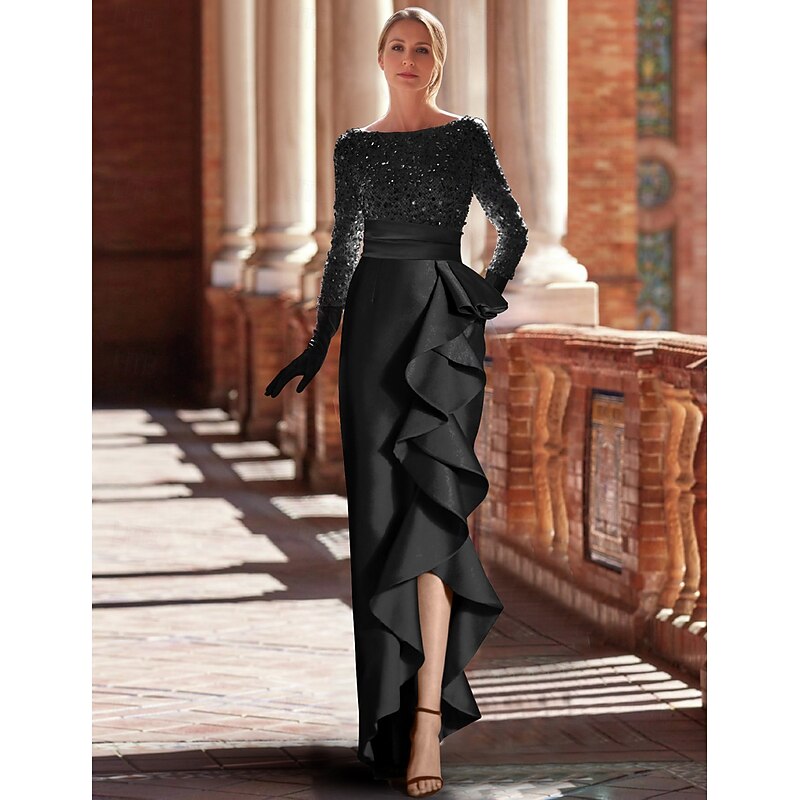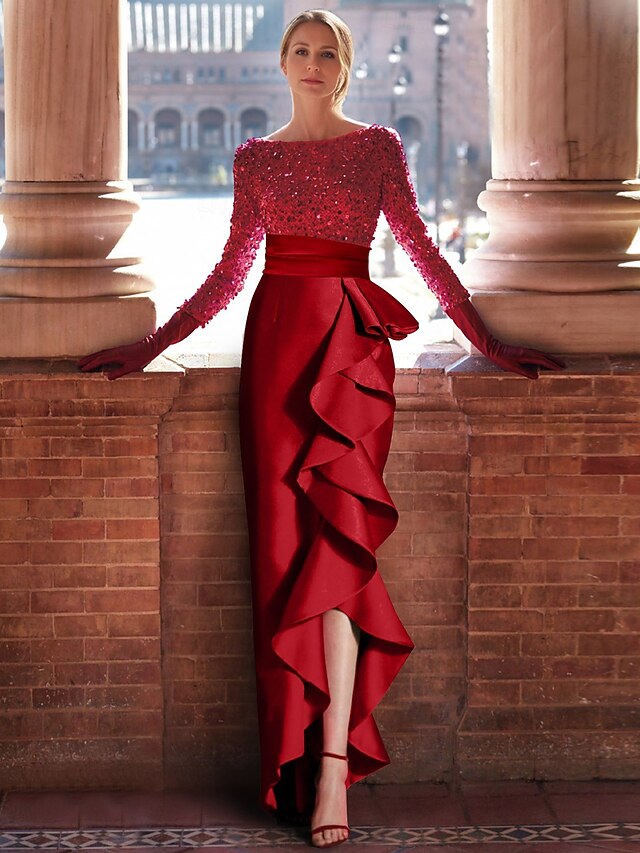 must-have ! A-Line Evening Gown Elegant Dress Formal Floor Length Long Sleeve Jewel Neck Satin with Ruffles Slit Masquerade Dress