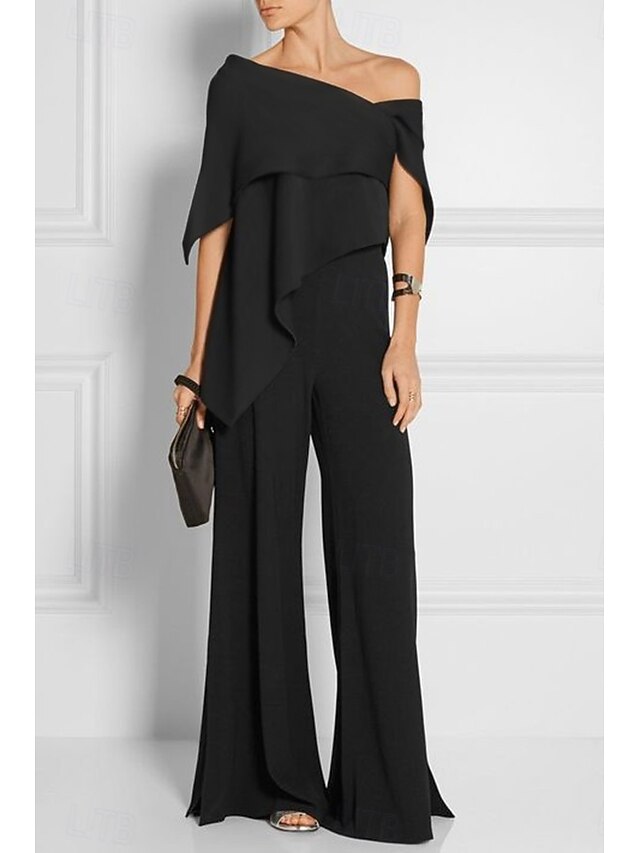 Jumpsuits Mother of the Bride Wedding Guest es Elegant  Formal Wedding Party Floor Length Short Sleeve Off Shoulder Fall Wedding Guest Chiffon with Ruffles 18