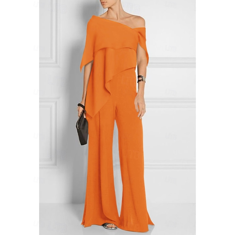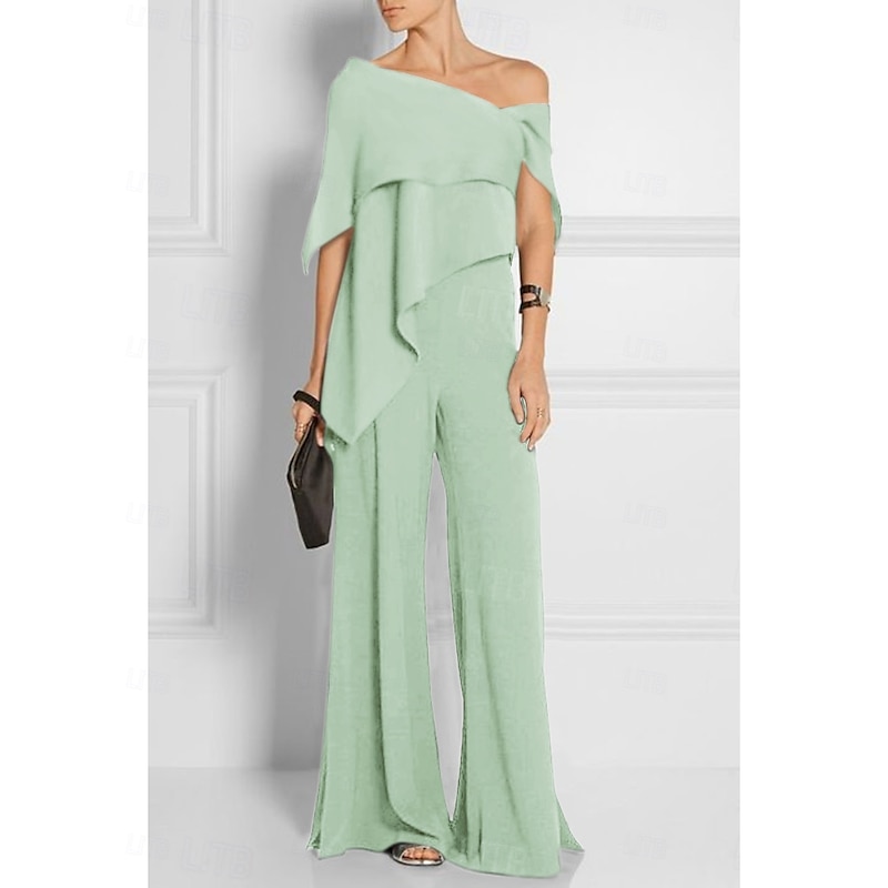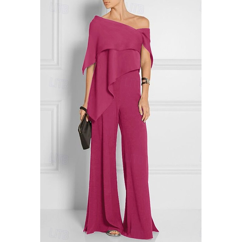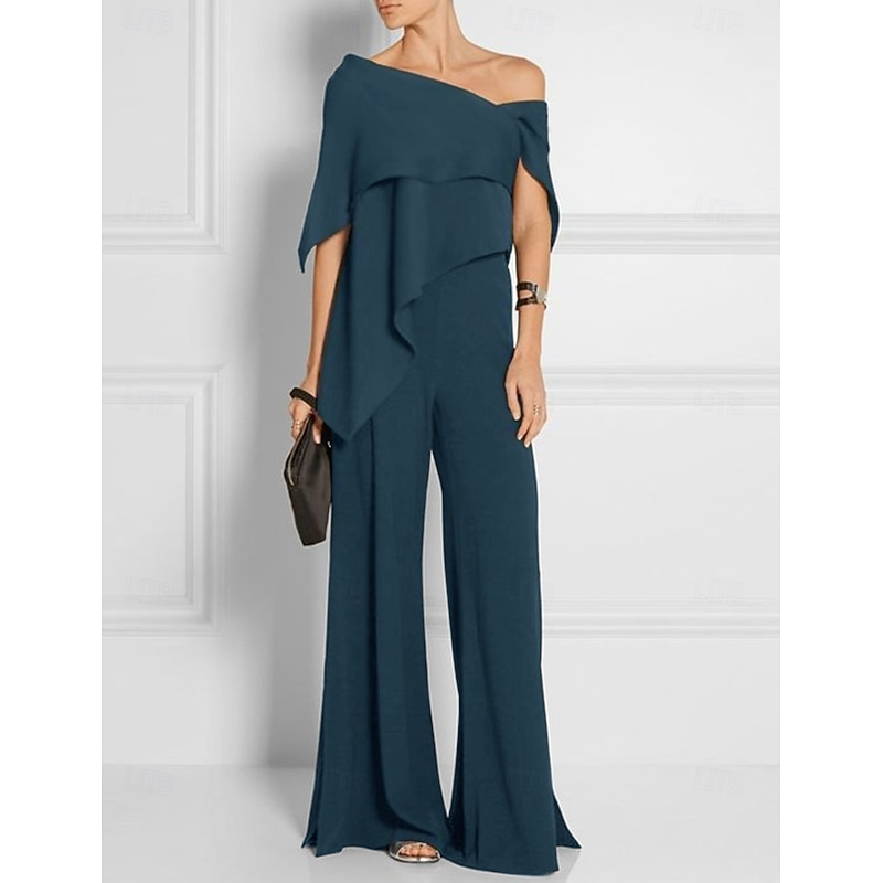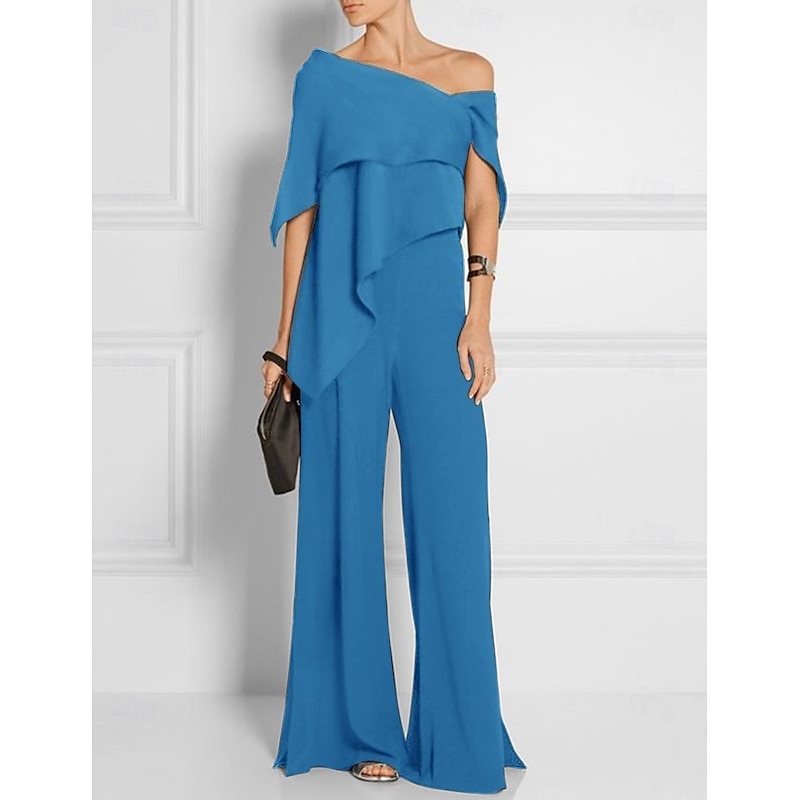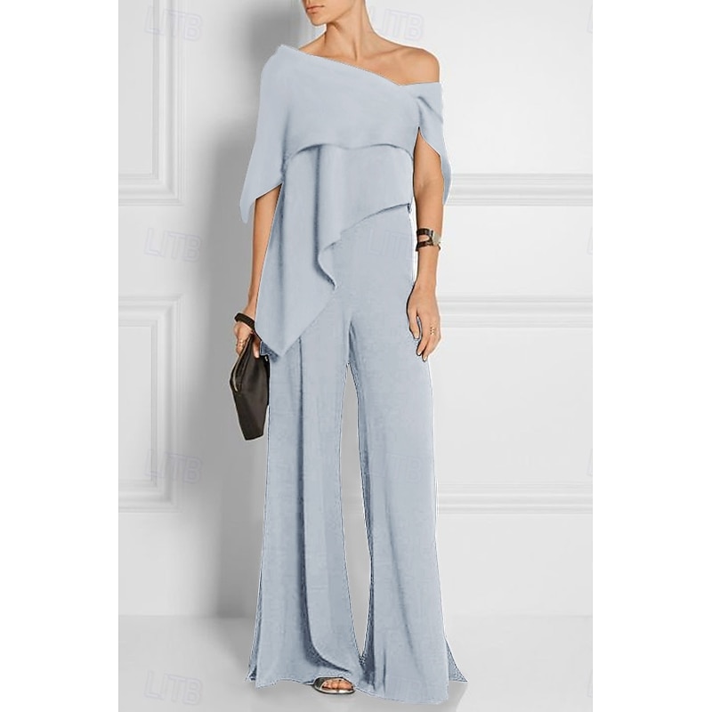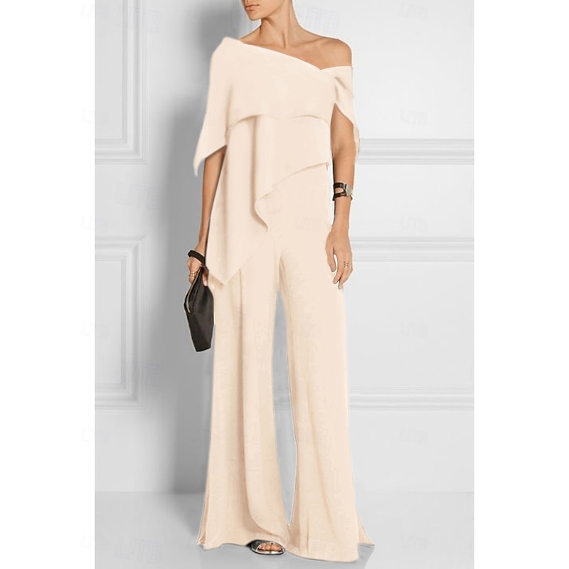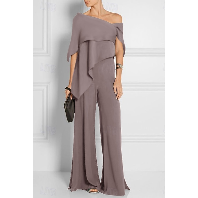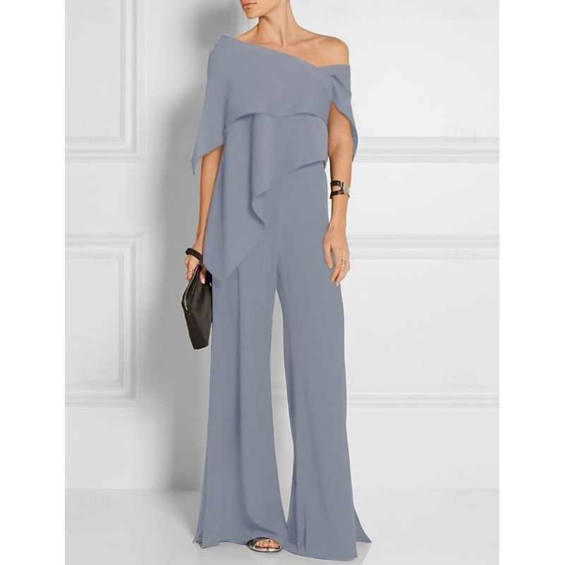 More information about Jumpsuits Mother of the Bride Wedding Guest es Elegant Formal Wedding Party Floor Length Short Sleeve Off Shoulder Fall Wedding Guest Chiffon with Ruffles