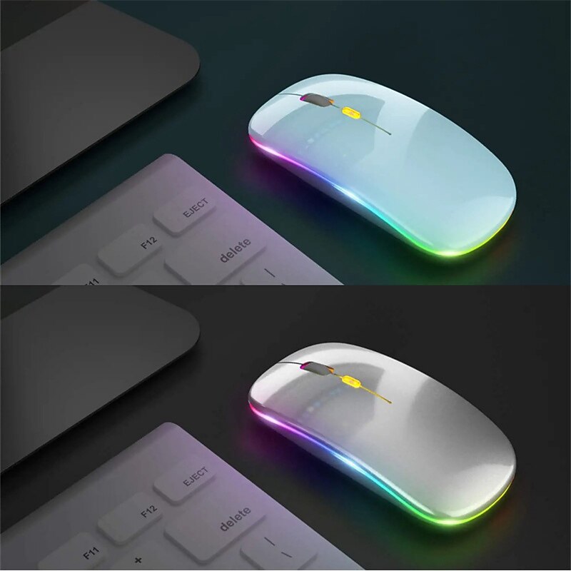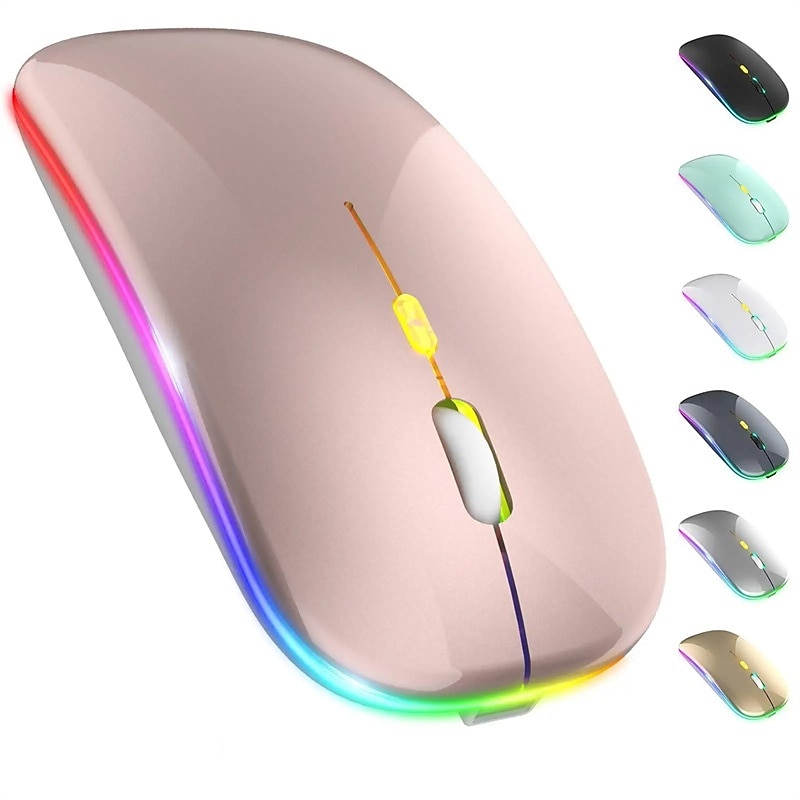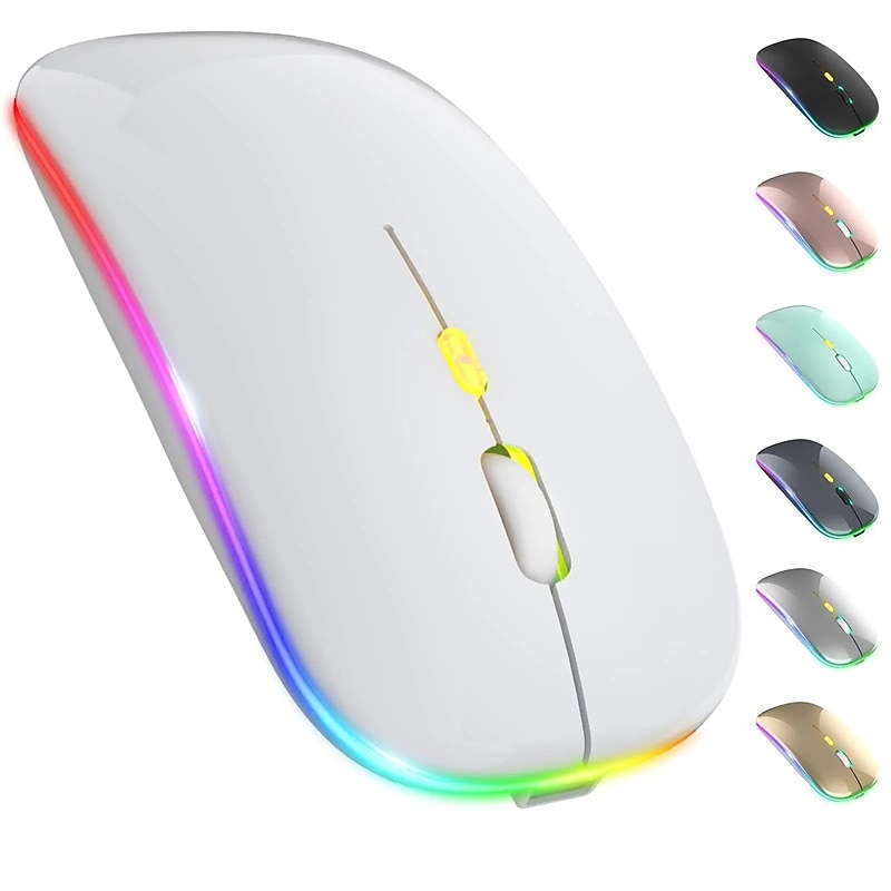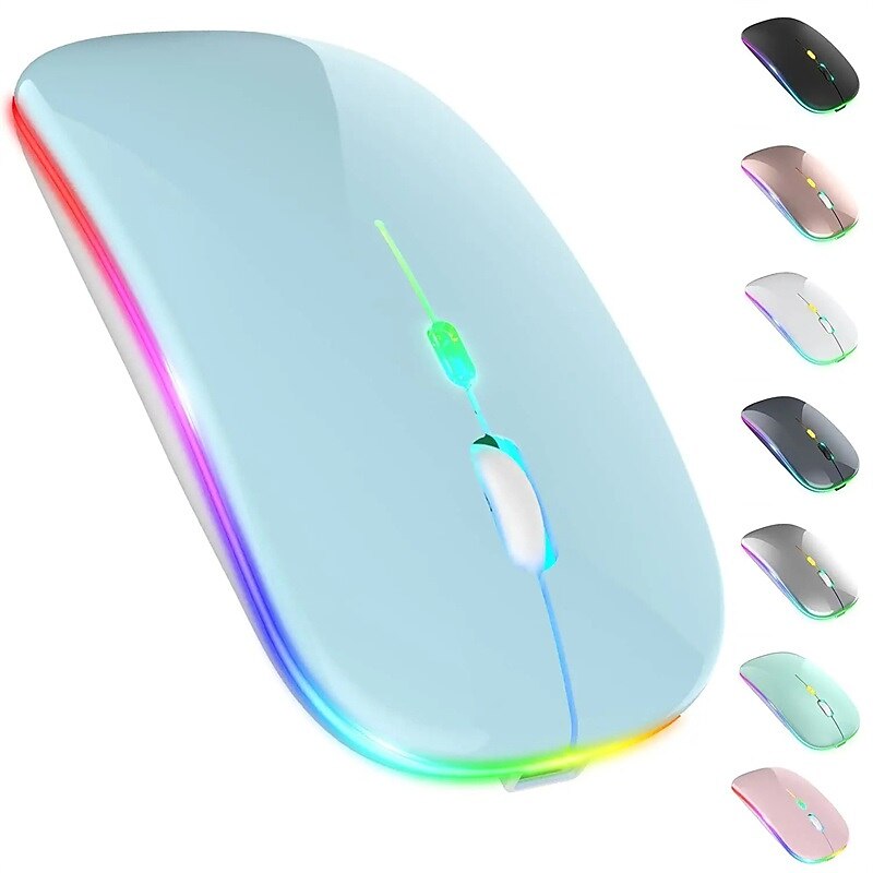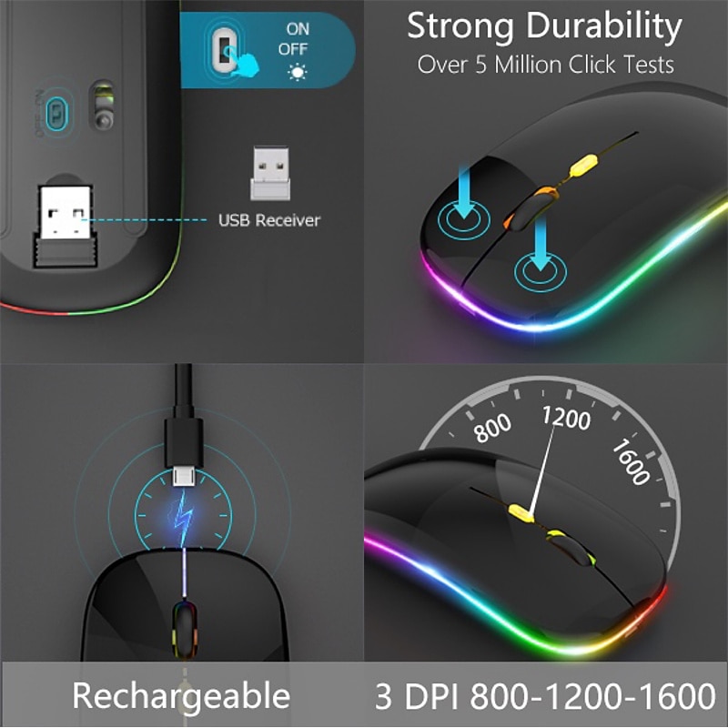 Highlights - 7 Colorful LED breathing light change alternately, creating a soothing and fun atmosphere in the dark. - Wireless and USB connectivity technology for convenience. - Optical movement detection technology for precise tracking. - 3 buttons for easy navigation. - Upgraded version with LED lights to add excitement to office life. - Switch at the bottom of the mouse allows for customizable lighting - low-key or sparkling. - Rechargeable built-in battery for easy charging with included USB cable. - 2 hours charging provides usage of 7-15 days. - Long standby time, energy-saving features, and automatic sleep mode. - Plug and play functionality - no driver installation required. - 2.4GHz wireless technology for powerful and reliable connection up to 10 meters. - Advanced optical tracking technology for fast click and responsiveness. - 3-level adjustable DPI (800/1200/1600 DPI) to suit different work requirements. - Equipped with USB-C to USB adapter for compatibility with various devices. - Mute click and relaxing hand-feeling with anti-fingerprint finish. - Silent button reduces 90% of noise, making it ideal for quiet environments. - Ultra-thin and ergonomic design for easy carrying and traveling. - Wide compatibility with various operating systems and devices. - Note: Cannot set the LED to a specific color. - Easy 3-step setup: charge the mouse, insert the dongle, and turn on the mouse switch. - Slow cursor movement or stoppage indicates low battery, so charge on time. - Blue light indicates charging, turning off when fully charged. Perfect for everyday use. first-class materials and excellent craftsmanship ensure long-lasting durability.