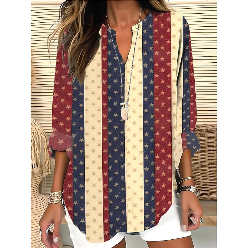 must-have ! Women's Blouse Tunic V Neck Long Sleeve Boho Casual Patriotic Flag Red White And Blue Short Sleeve Regular Tops Daily Print Red Light Brown Blue