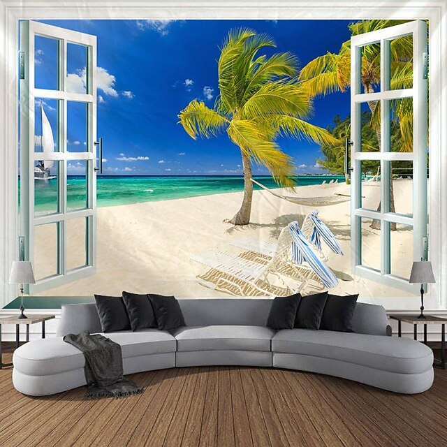 Beach Window View Hanging Tapestry Wall Art Large Tapestry Mural Decor Photograph Backdrop Blanket Curtain Home Bedroom Living Room Decoration