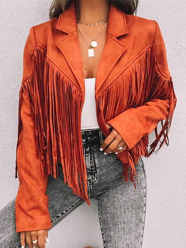Highlights [Fabric] : Crafted from a suede-like material, this women's jacket offers a soft and luxurious feel with a micro-elastic texture that ensures both comfort and style. The vibrant maroon color is complemented by a solid pattern, making it a versatile addition to any wardrobe. [Fit] : Designed with a regular fit, this short outerwear piece features a timeless lapel collar and an open-front style, providing a slightly relaxed silhouette that is ideal for layering over different outfits. The tailored yet comfortable fit makes it suitable for daily wear and going out. [Design Highlights] : The jacket features a trendy fringe detail that adds a bohemian touch, enhancing its vintage and fashionable vibe. The long sleeves contribute to the windproof function, offering practicality as well as style. A V-neckline completes the sophisticated look. [Occasions] : Perfect for daily wear and casual outings, this jacket is a great choice for any season, including spring, summer, fall, and winter. Whether you're heading out for a weekend gathering or simply running errands, this piece effortlessly elevates any ensemble. [Size Range] : Available in a variety of sizes, including S, M, L, and XL, this jacket ensures a great fit for different body types, allowing you to select the size that best suits your personal style and comfort needs. Perfect for everyday use. premium materials and excellent craftsmanship ensure long-lasting durability.